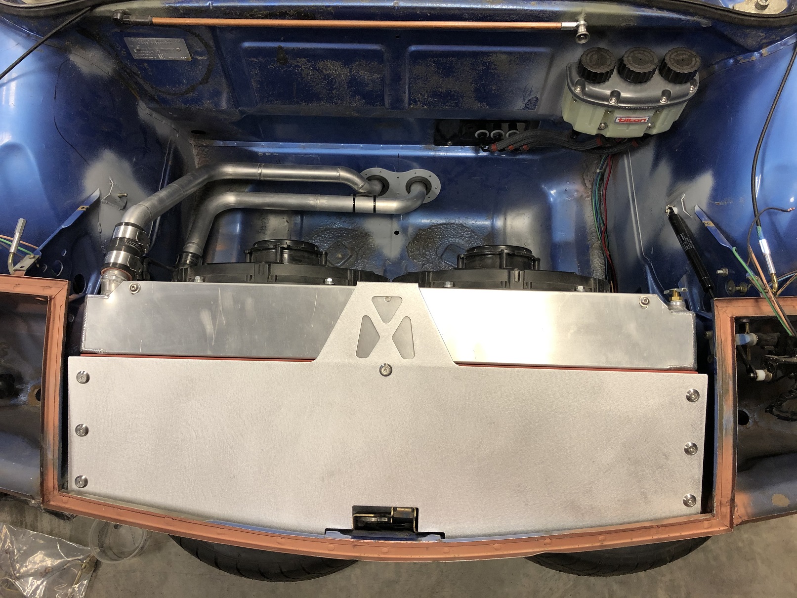 Boring photo but this is the "buttoned up enough to run" frunk: - radiator hose pass through panel temporarily pop riveted (can't final rivet it until the car is painted) - fan relays wired and tested - radiator hard lines fully installed - radiator shroud in place - brake/clutch reservoirs ready for fluids For those wondering, "what's up with that plain radiator shroud?", I have yet to source/layup the carbon fiber inserts for the stamped shroud and beyond that, it'll need to be painted ahead of bonding in the inserts. So, because I'm focused on doing only what's needed to get it running and driving, and I have to have some sort of shroud, I cut this aluminum version. Virtually no style points, only what's needed. @Rand , aren't you proud of me? (IMG:style_emoticons/default/shades.gif) Attached thumbnail(s) |