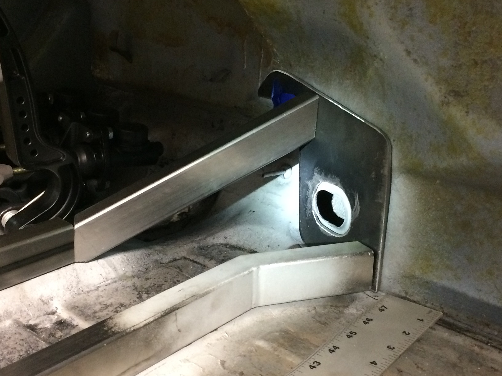 On to floor fitment. With the custom lower fire wall comes mods to the rear floor panel. Long story short, the floor is about 1" too long in just the perfect way so the flat that needs to spot weld to the bottom of the lower cross bar juuuuuuust misses.