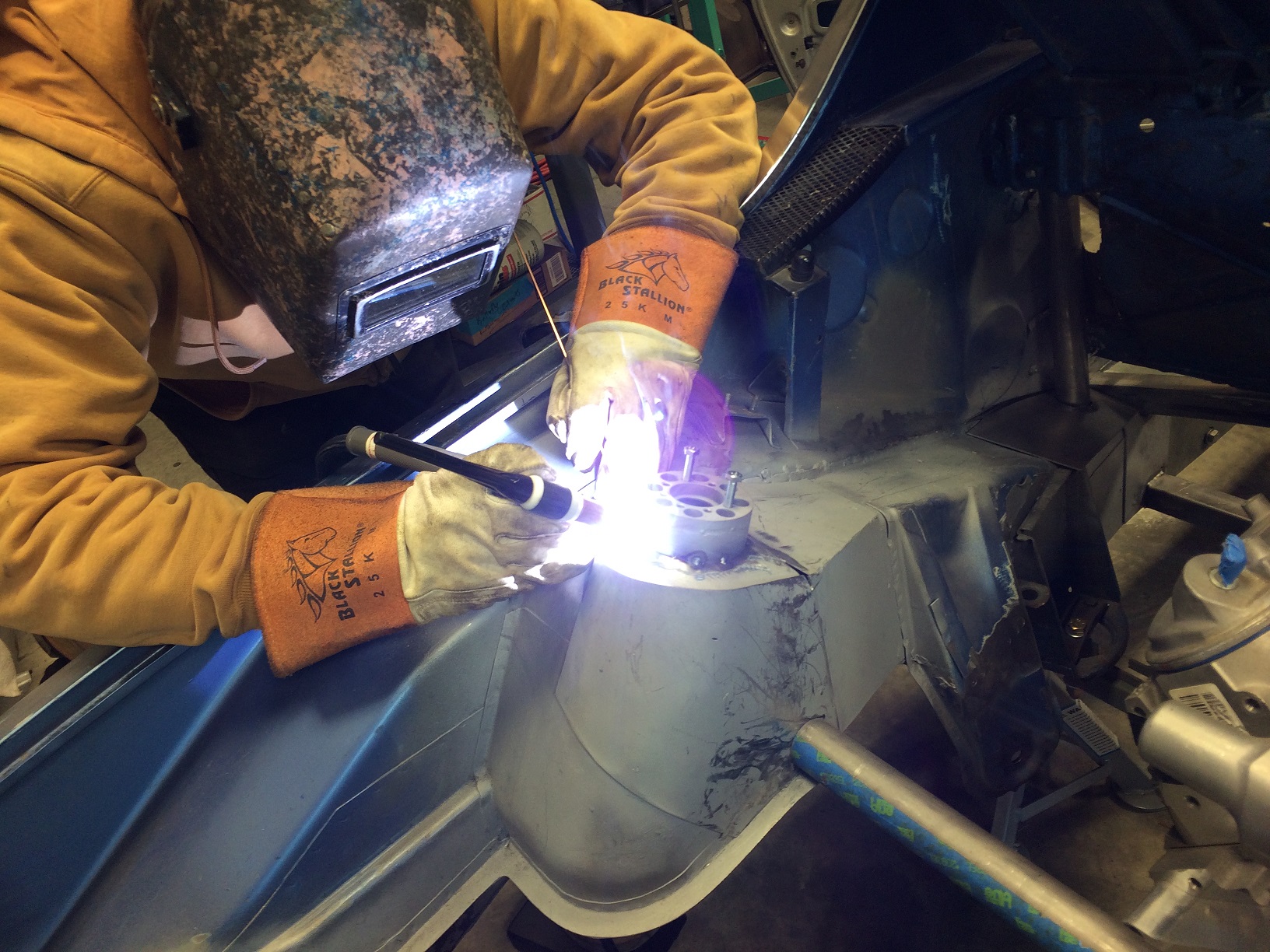 ^ I love welding clean thick steel Nothing more satisfying than making dimes with a mig. Judging by your heat marks your welds should have good penetration, at least that horizontal piece. You didnt make great penetration on your vertical weld to the firewall. Yep, I was noticing that. I think I'll do another pass. Like I said, the out-of-position stuff is such fun. A little off on the angle when I couldn't quite get my line of sight where I wish I could have... |