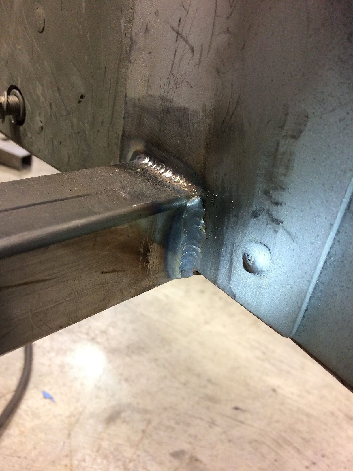 Judging by your heat marks your welds should have good penetration, at least that horizontal piece. You didnt make great penetration on your vertical weld to the firewall. |