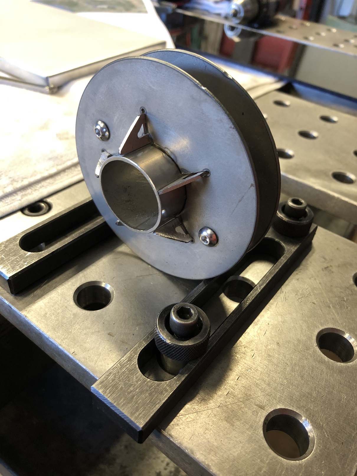 I worked out a little fixture for the exhaust inserts that makes it easy to accurately locate the 5 vanes.