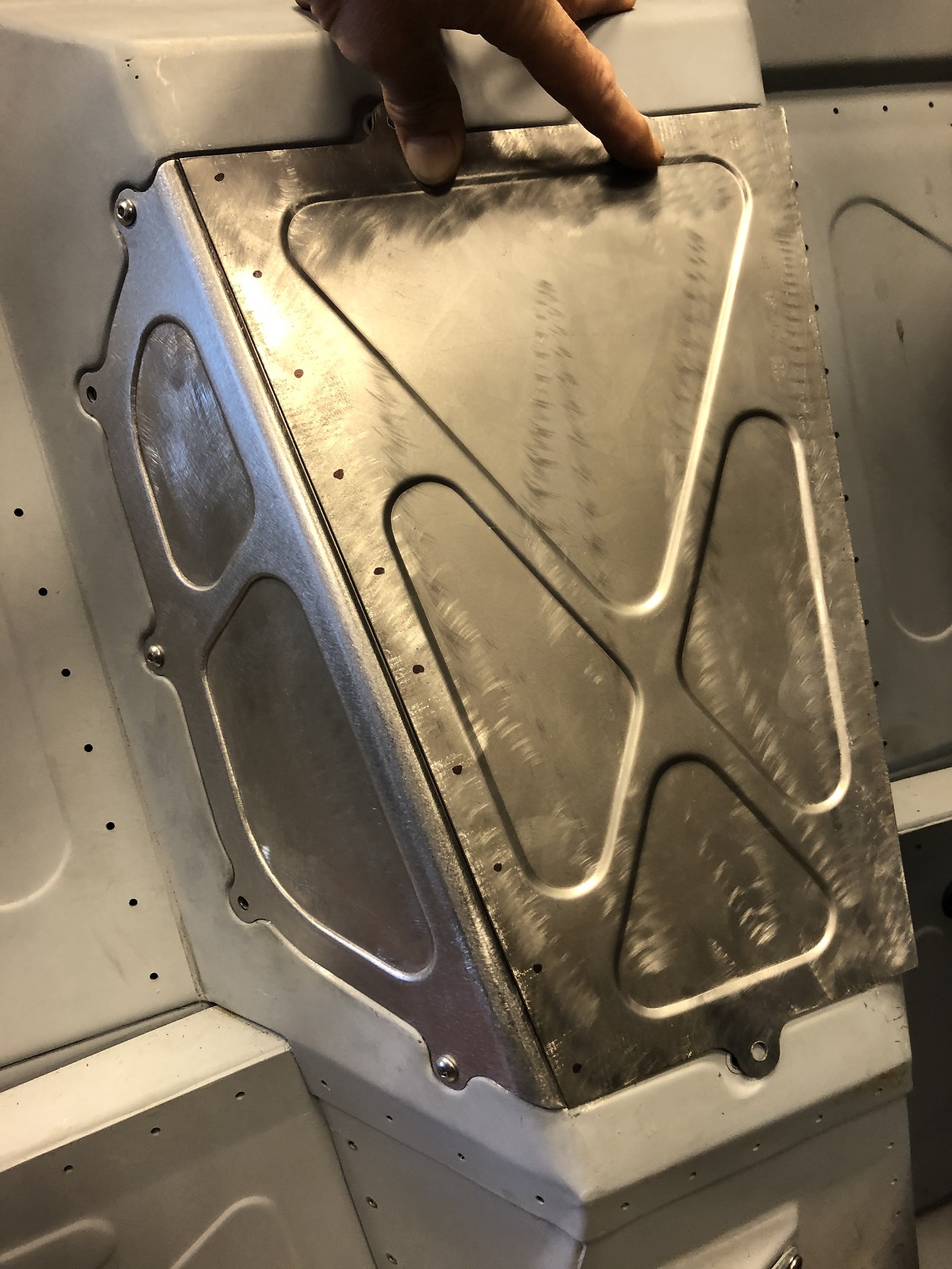 Today as I was looking at the access panel I was about to redo for the 3rd time (IMG:style_emoticons/default/huh.gif) , it struck me that instead of welding the panels together, I could rivet them. That should (?) leave me with a more cohesive look, IMO, given all the other rivet lines in the interior. Remember, the top panel of the console will be riveted on and using rivets on the access cover will carry the look right up to the rivet line at the top of the firewall. Back to CAD, then cut and stamp new side panels! I extended them enough to be able to radius bend them and end up with a return to which the front panel will be riveted. Forgive my drawn on rivets, I just wanted to get a feel for the look. I think I'll put a step in the returns so the front panel sits flush vs one panel thickness proud, as in this pic. Still some trimming and fitting to do, but you get the idea. Attached thumbnail(s) |