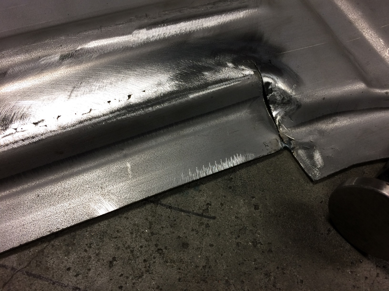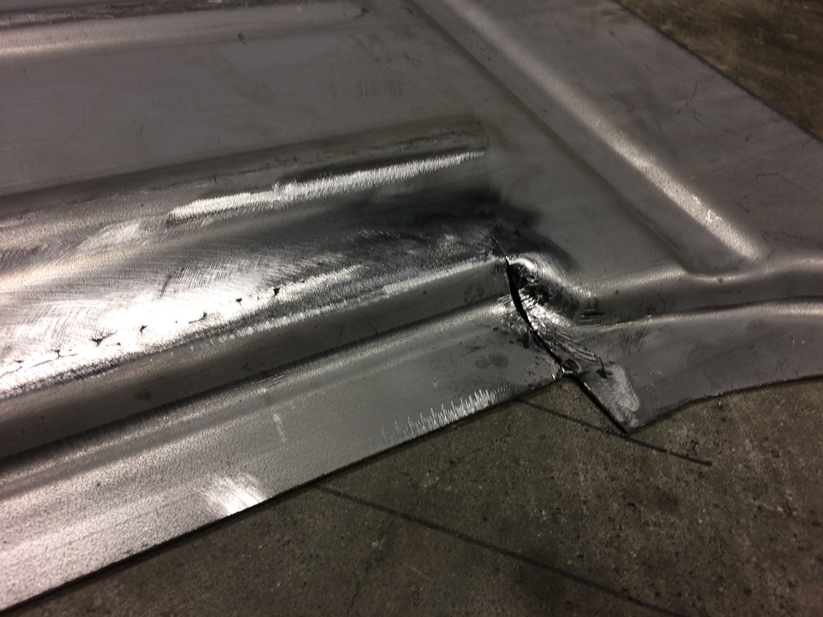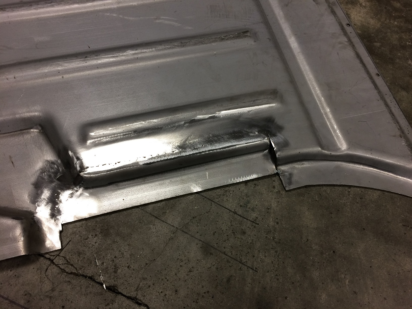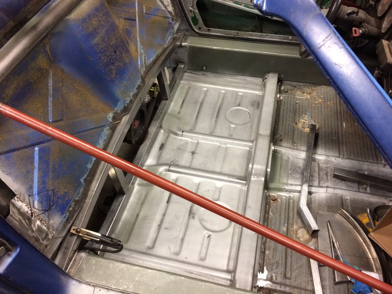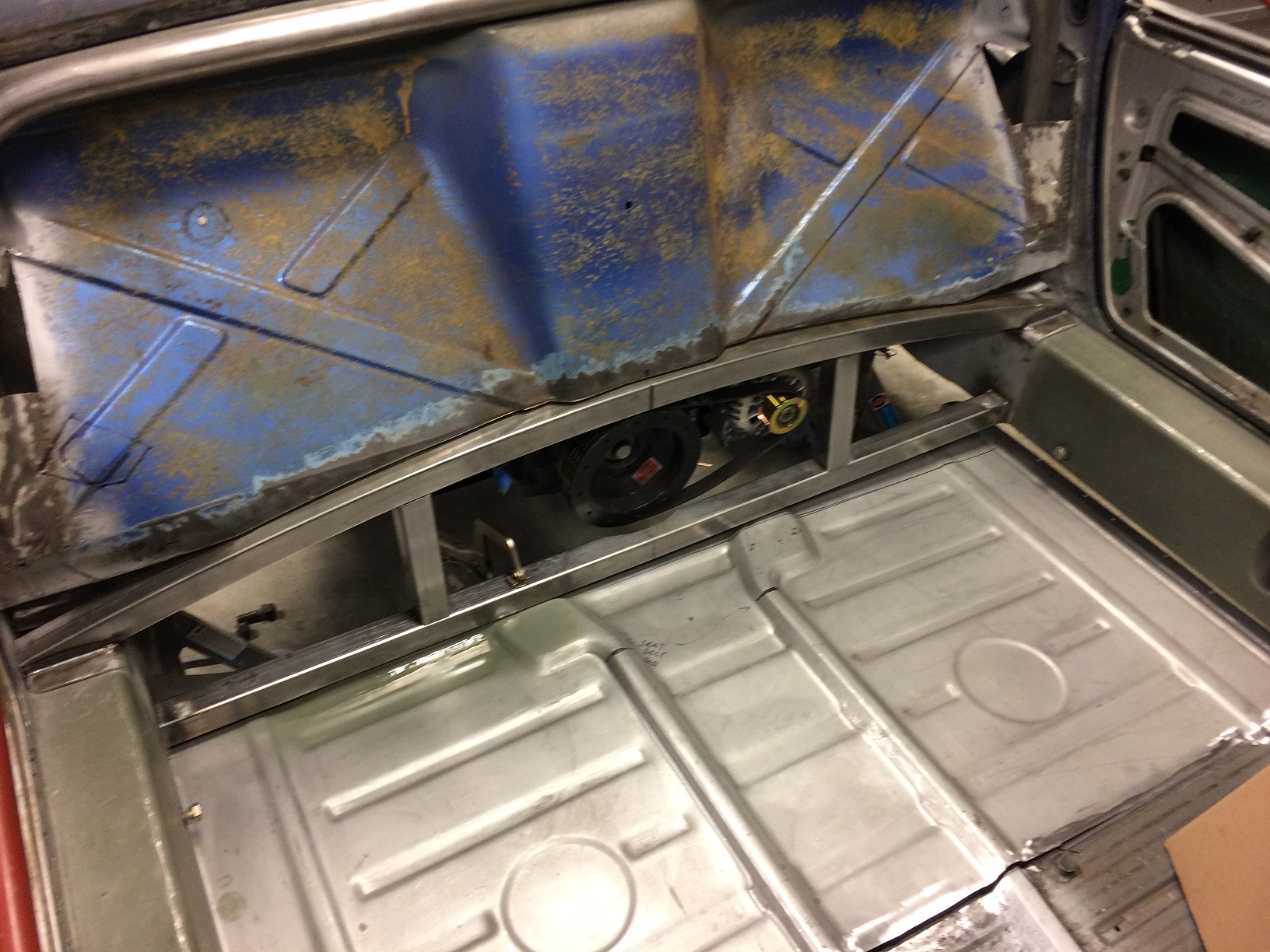 The floor is in. Well, all but a few inches of the main joint. Then I need to dress the welds. I'm going to run the stock cross bar because: