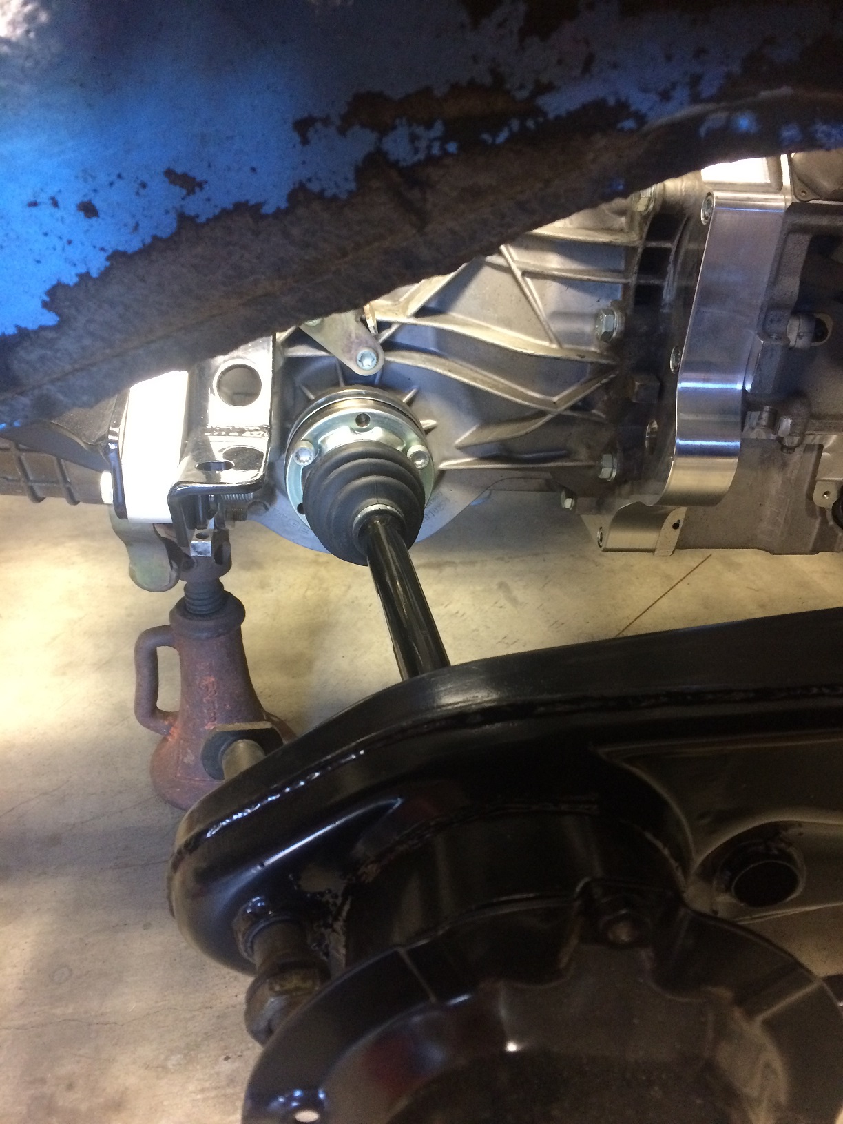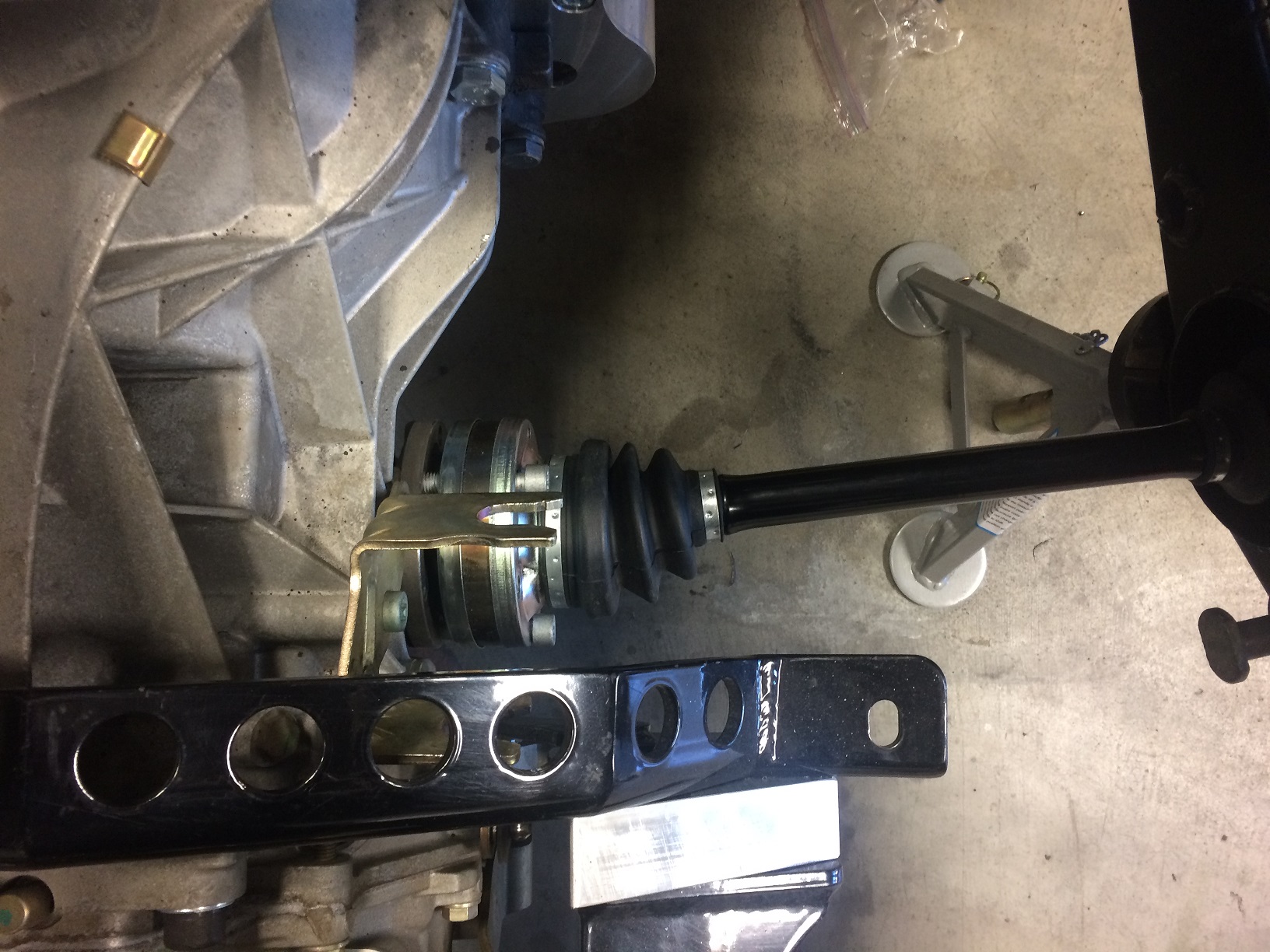 It's kinda hard to tell in the pics, but I have a reasonably relaxed CV angle. (IMG:style_emoticons/default/cheer.gif) This should address any concerns about CV / CV boot failure. Maybe someone (Tony?) could post a pic of what this looks like with the trans in the "stock" location? And yes, there is a spacer that goes between the inner CV and the output drive. I just didn't have long enough bolts... Attached thumbnail(s) |