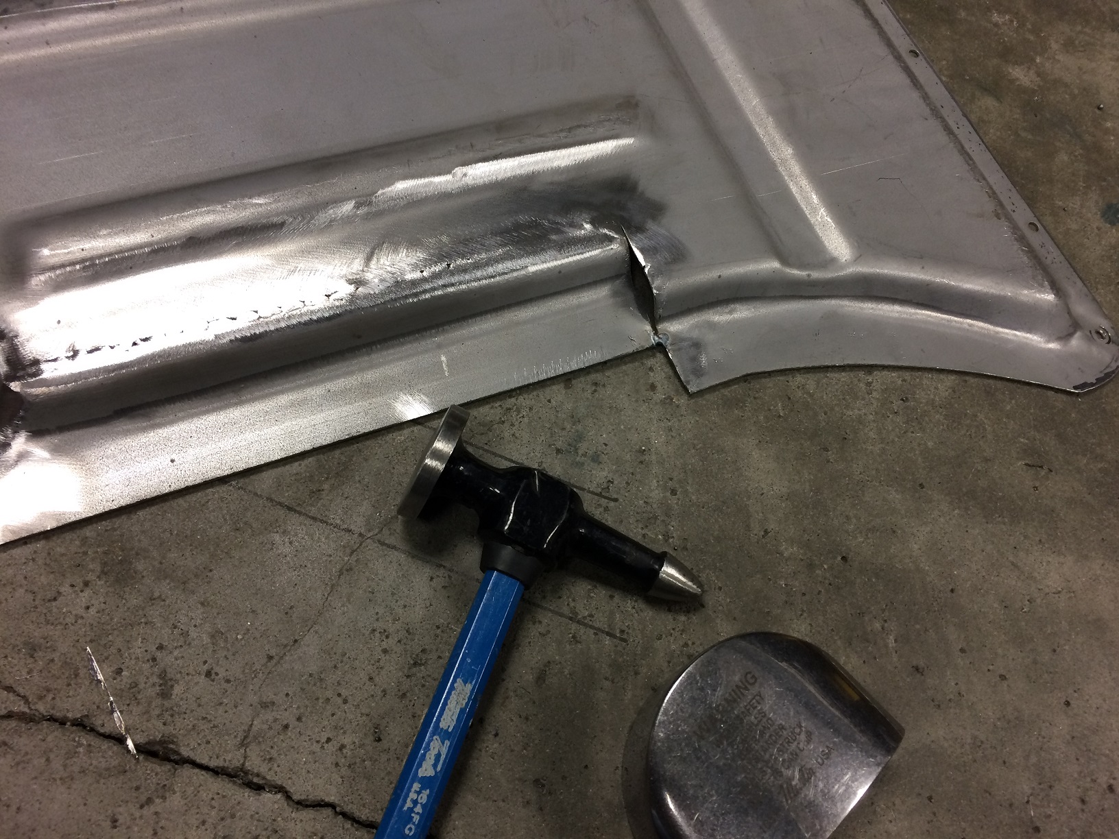 1. Cut and move that rear section forward. 2. The gap I need to close 3. Start hammering the curve back into itself 4. Overall shape is where I want it so I'm calling it finished and ready to weld! Next, I mock it back into the car and trim the edge to match the jacking donut triangle. This floor is all but ready to go in! Attached thumbnail(s) |