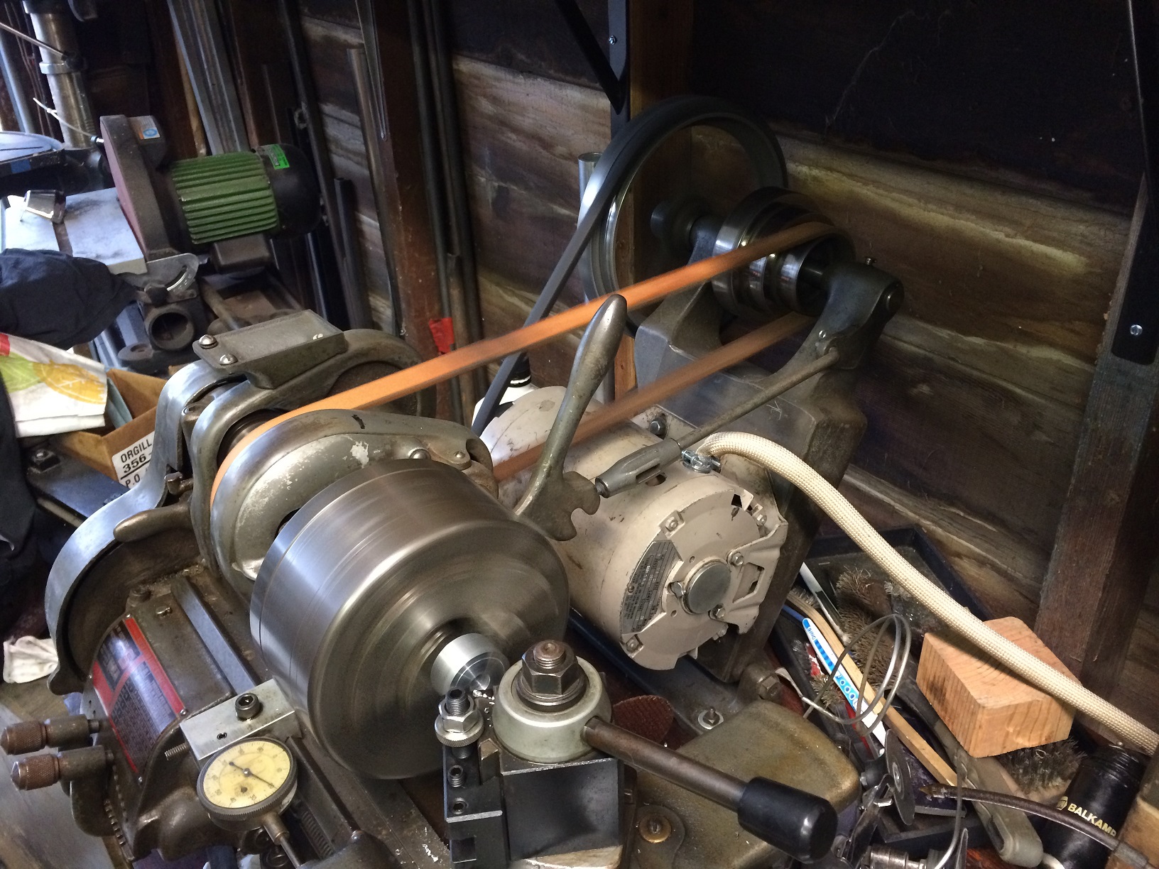 How's this for old school? Neat old, belt driven South Bend lathe. Works like a champ! Sweet! You're missing out on the authentic antique experience with that Aloris tool post though! (IMG:style_emoticons/default/happy11.gif) |