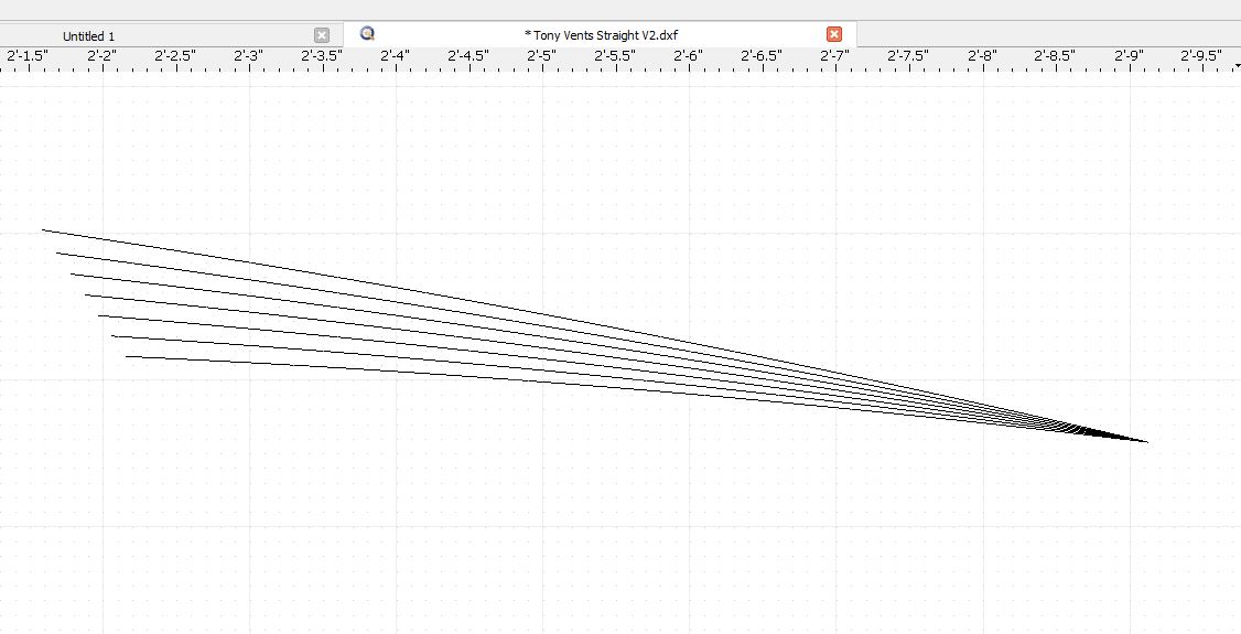 The original straight version on the right, the new one on the left. So, this new one takes the difference in length of the vertical sides and divides that by seven. Starting with the bottom vane, the distance between its "long side" bend point and the same side bend point of the next vane grows by 1/7 the difference. That 1/7 is again added to the previous distance until all vanes are located. That 2nd pic is a composite of the top edge from each vane (91.4" radius), showing the unique angle of each. If you think the vanes' top edges should follow the frame's curve, they can't. If they did, once the vanes are bent into position, the upper edge corners would sit higher than the middle, as was pointed out to me by @dr.tim , back on post #2403. Anyway, there you go. I'm out of material so it'll be a couple days before I cut anything else. And I'm with @Cairo94507 Michael, I need to get the vents set on both sides and start looking at a more complete front end view. Attached image(s)
