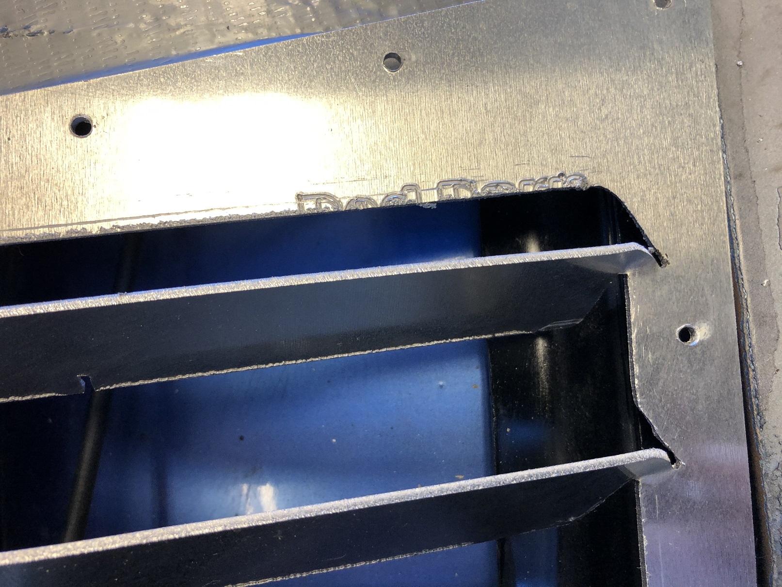 My plasma table has an engraver attachment that can scribe the metal so why not? If I like it, I'll only add it on the driver side vent. For the tool whores: All that's needed is to establish the separate layers in CAD then set up the G-code to run the appropriate operation for each layer. I color-code each layer so it's easier for me to see: - first run the engraver on the text (in blue) - switch to the plasma torch to "drill" the holes (in red) - cut the vent (in black) Be sure to get the order right so you don't cut an outside shape then come back and try another operation on a "floating" part! Not that I've ever done that... (IMG:style_emoticons/default/headbang.gif) The 2nd pic is a snip visual of the overall cut program. This is what generates the code that runs the plasma table. Note that it shows I'm cutting 16ga stainless. That's just the "tool" I use to cut .063 aluminum. The "tools" are just presets for voltage, cut height, travel speed, etc. It has nothing to do with the actual material being cut. Attached thumbnail(s) Attached image(s)