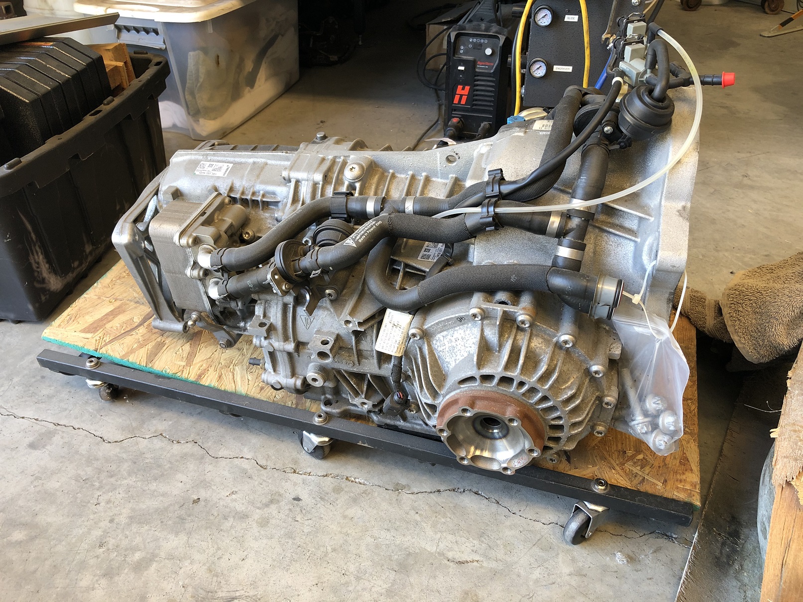 Here's a Cayman PDK. It's sitting in my shop. Other pic is the PDK-to-LS3 adapter. My tuner is working on a conversion "kit" that will enable my 8-stack induction to be converted to drive-by-wire. This means the PDK/LS contraption will do all that fancy stuff like auto-blip downshifts, etc. What could possibly go wrong? While it's true I've already purchased the PDK, I haven't fully committed to doing this. More to come as I think it through. Attached thumbnail(s) Attached image(s)