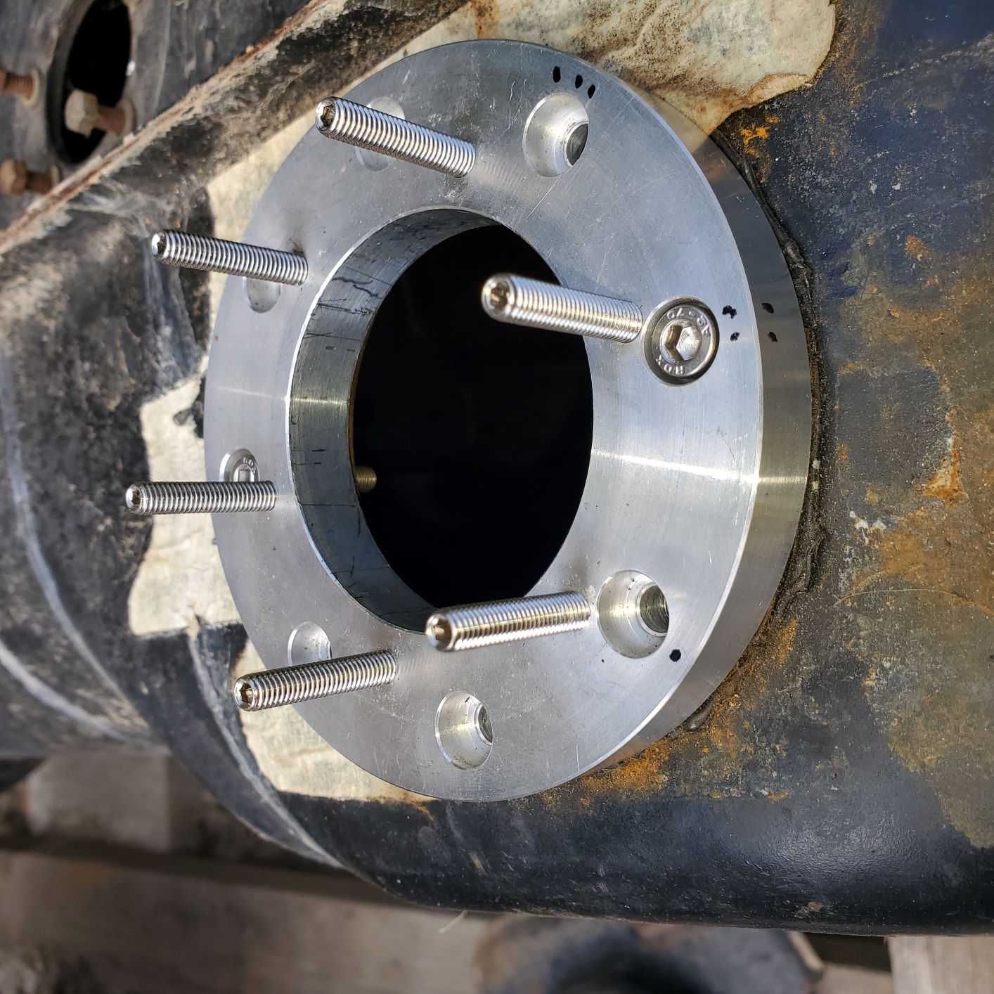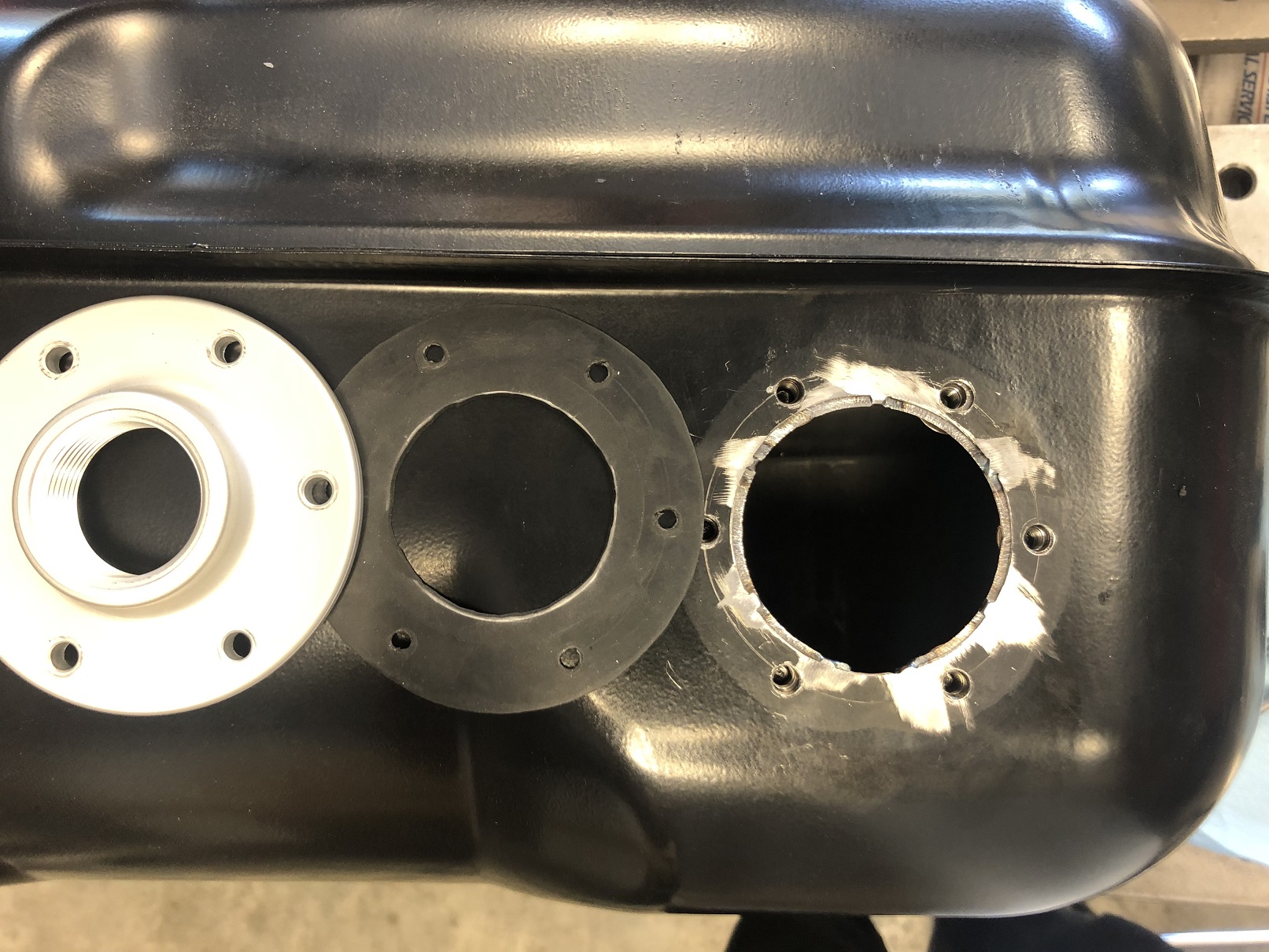 Fuel tank V3: Live and learn. That giant fuel cap that seemed like a great idea? Turns out that in order to fill the tank, I have to use my hand to release the pump handle's fill neck seal/trigger contraption to get the pump to flow. Better is that in order to comfortably do that, my head ends up under the hood, right above the unsealed filler. I decided I didn't want to breath fumes like that... So. I bought a new tank ($212 shipped - from Parts Geek, of all places) and started over. My goal with this version is no welding on the tank. The big filler cap required that I mod the tank to create a large enough flat mounting surface. Not required with this smaller filler - and it worked out great. I think it looks good, too. On to fitting the in-tank pump, which looks like it, too, can be installed with no welding. Chris, That Holley fill cap, is it located in the same place as the original Porsche fill cap? Are you going to add a vent and expansion tank? What are you doing for the fuel pump and its location? I'm currently adding a small Holley fill cap, but in the same position as you did with your original large flat fill cap. The tank surface is not very flat in this area, so I'm not sure how to get a good seal with the Holley o-ring. I'll probably machine a steel split ring to back it up. In the stock fill cap location, I'm installing a FiTech drop in fuel pump module with an adapter ring for a bolt in configuration (no welding). I'll shoot some photos to share. Andys  |