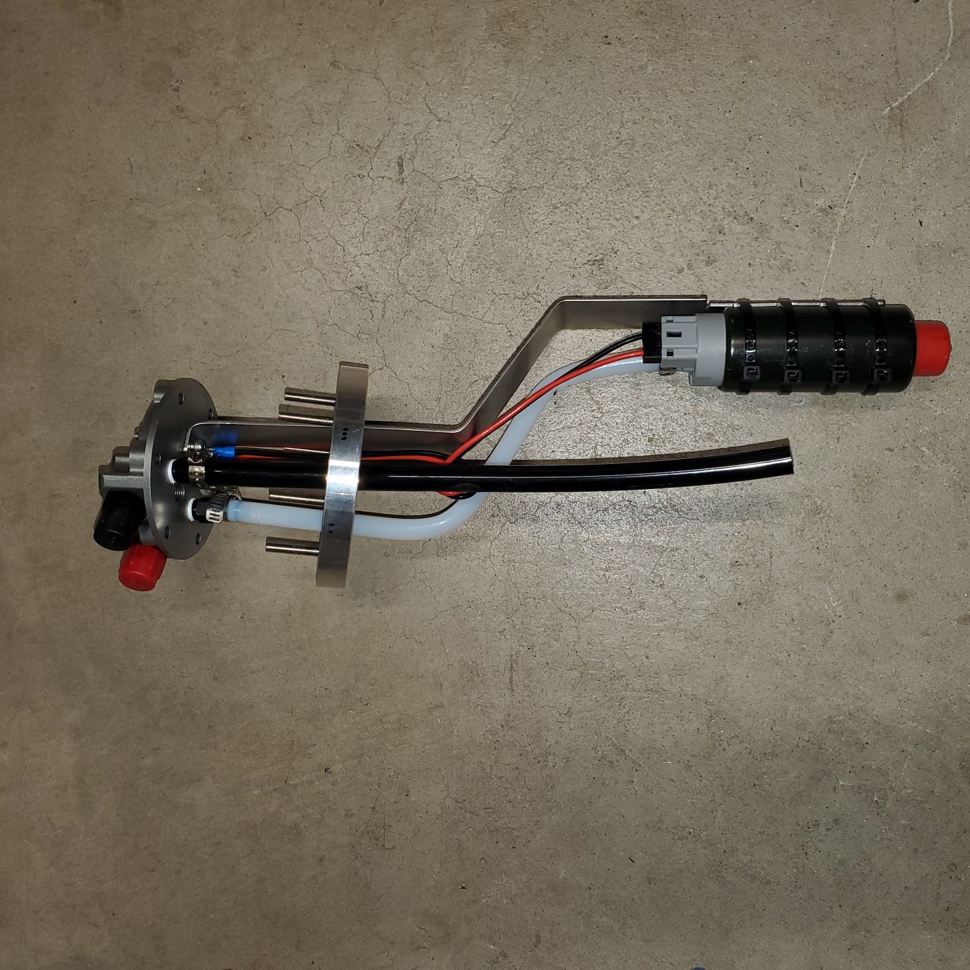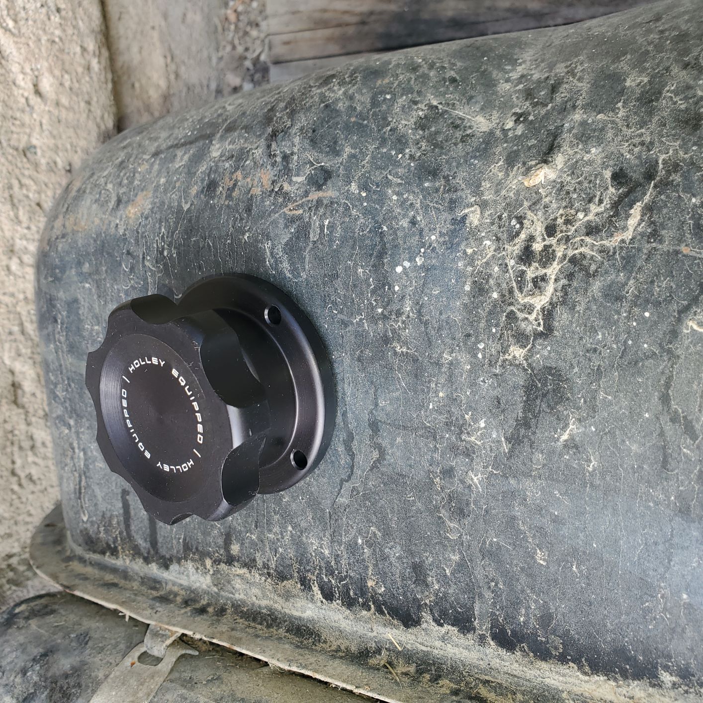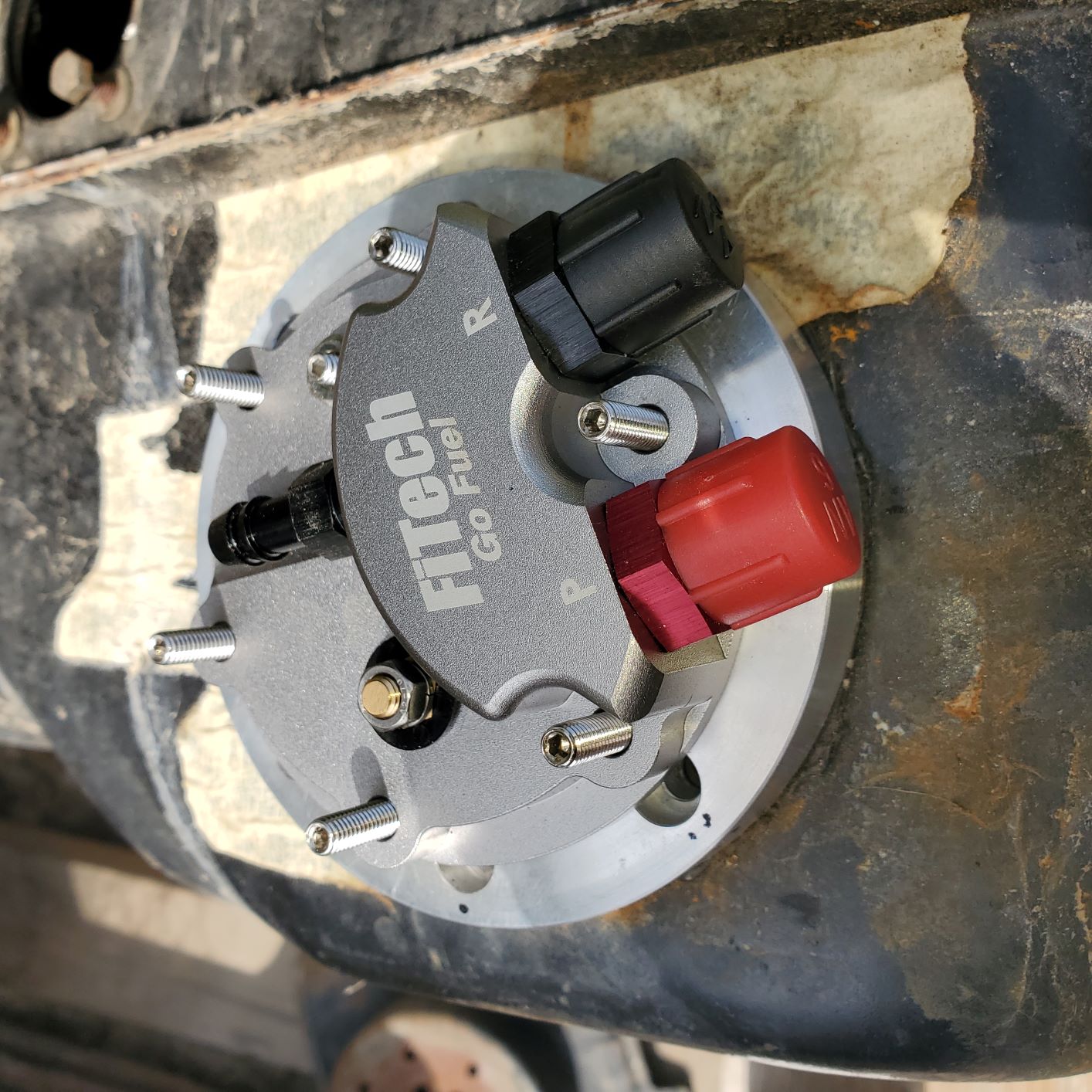 Here are the photos of the Holley fill cap, the FiTech pump module, and adapter. Sorry for the crappy back yard rusty fuel tank, but you get the picture.
