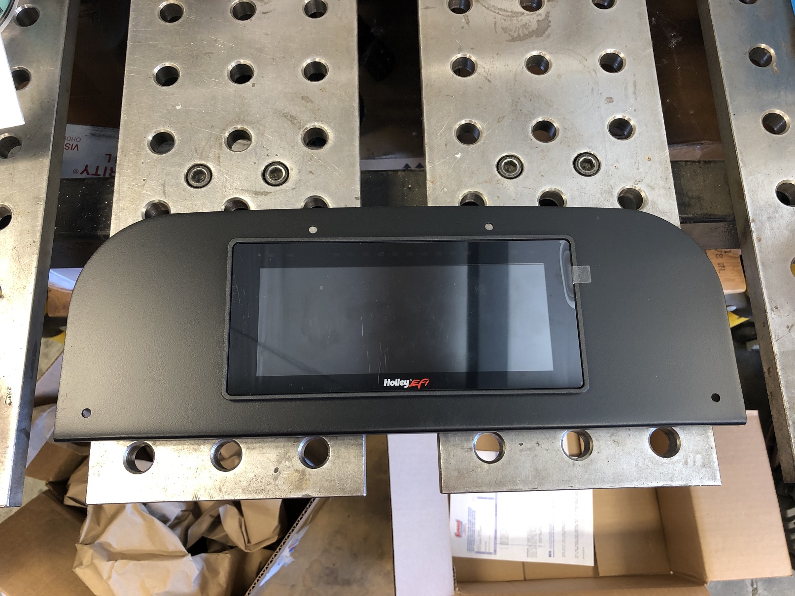 Initial fitting of the ashtray-delete fiberglass dash top with the Holley dash in place. Silver fasteners? Black fasteners? Oh! Maybe rivets all around the outside, to echo the fire wall? I'll have to see how I feel as I look at it a bit more.