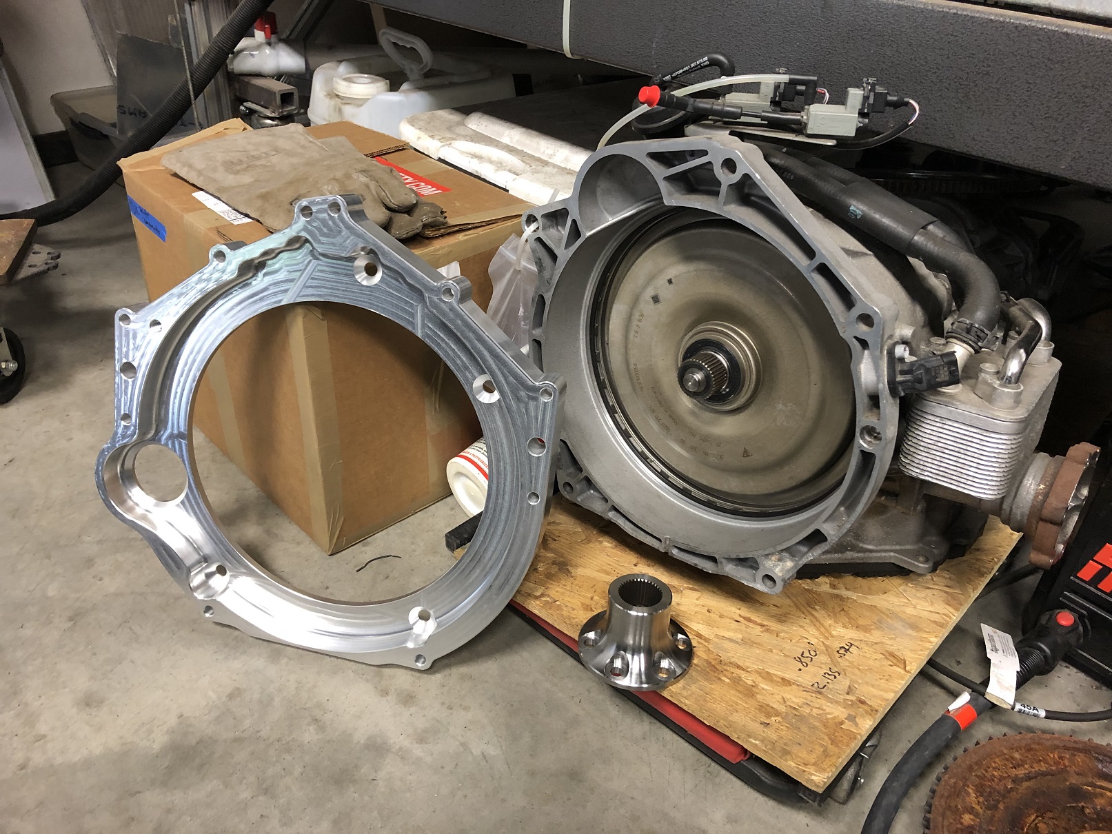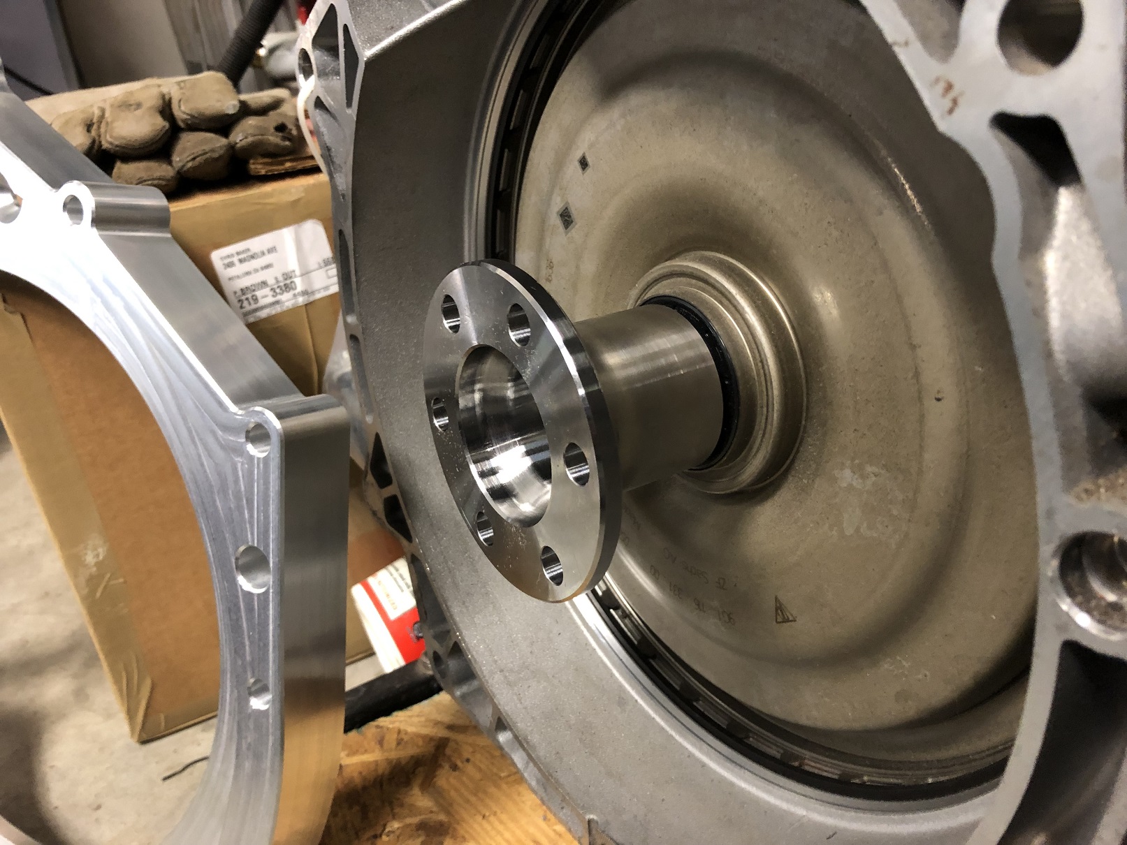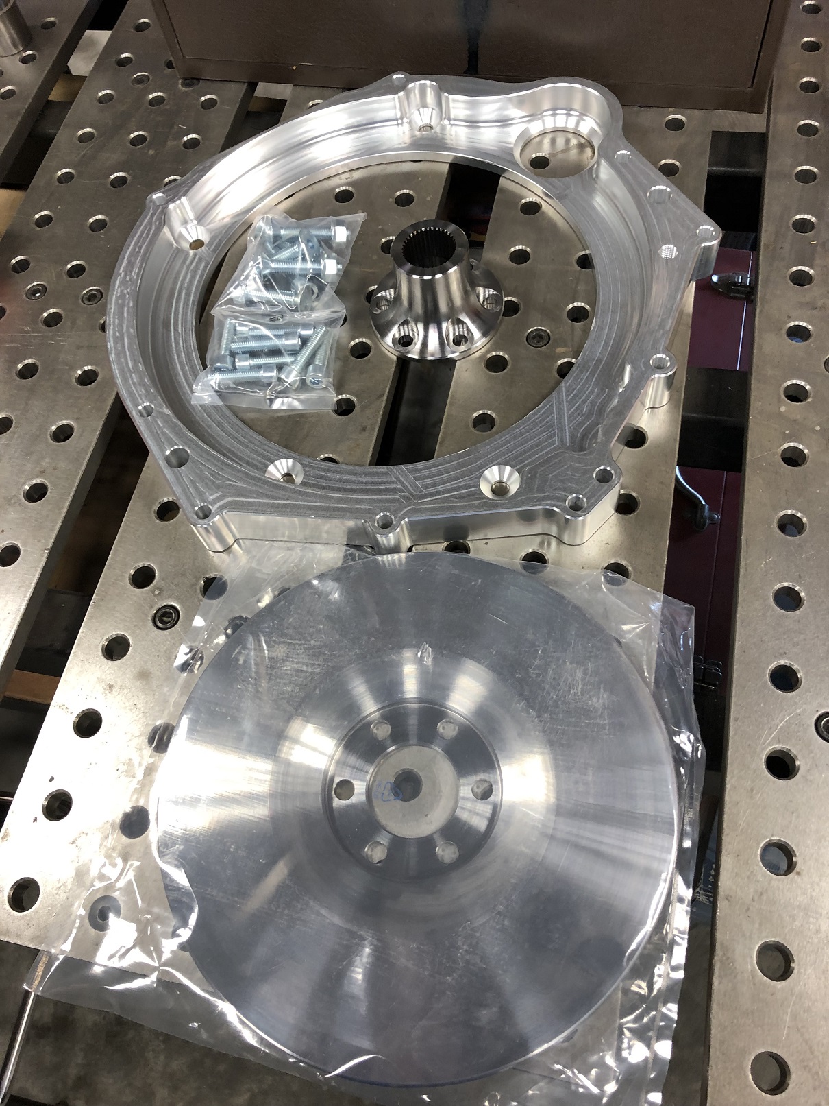 The other parts of the adapter kit. The PDK clutches stay attached to the trans. The plate you see here is the flywheel. A bit funny looking with no bolt holes other than for the coupler flange. An LS flex plate gets put in there, too, so there'll be a ring gear for the starter.