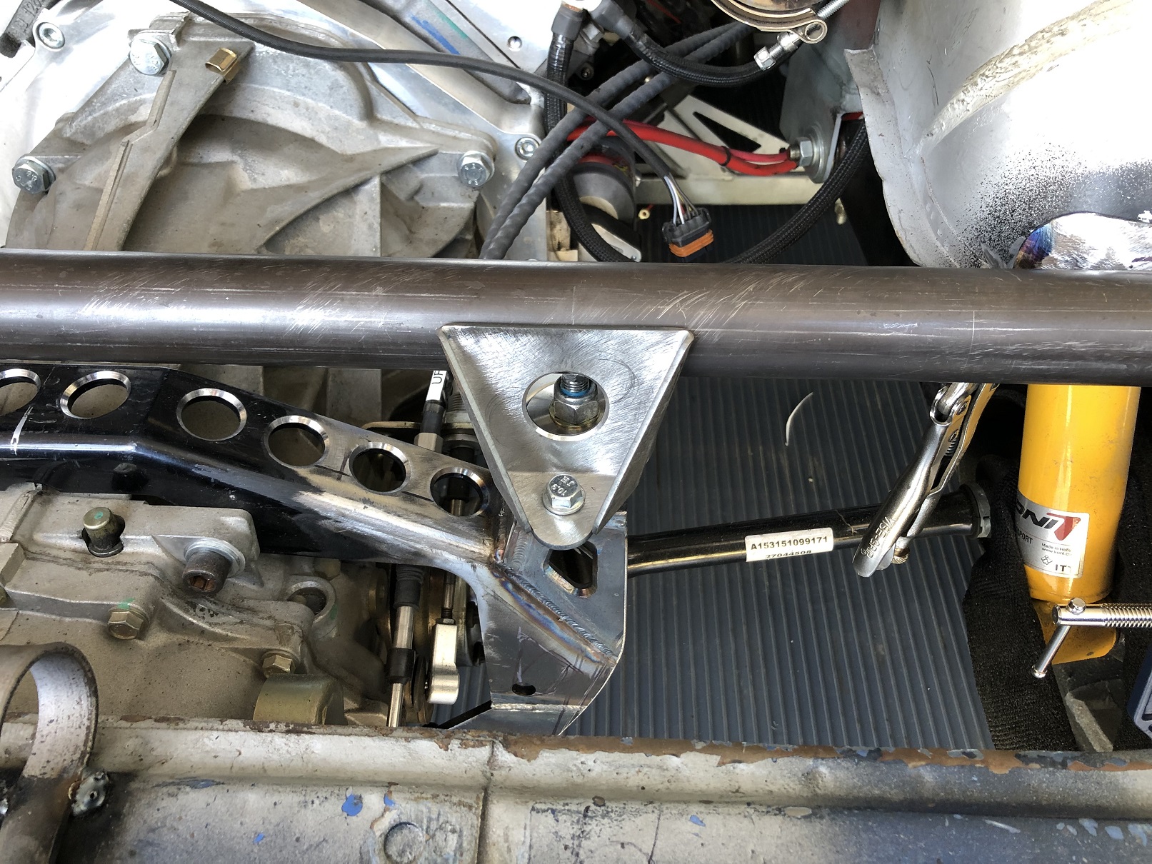 Then the cross bar gets the "trim, test fit, trim, test fit..." treatment until everything sits in its "happy place"! The front edge of the tube was trimmed (vs. cutting into the shock tower) to get the tube to move forward enough to center over the new mount location. This approach made it simpler to solve for the spreader plates. Anyway, it's all ready for final welding to commence.