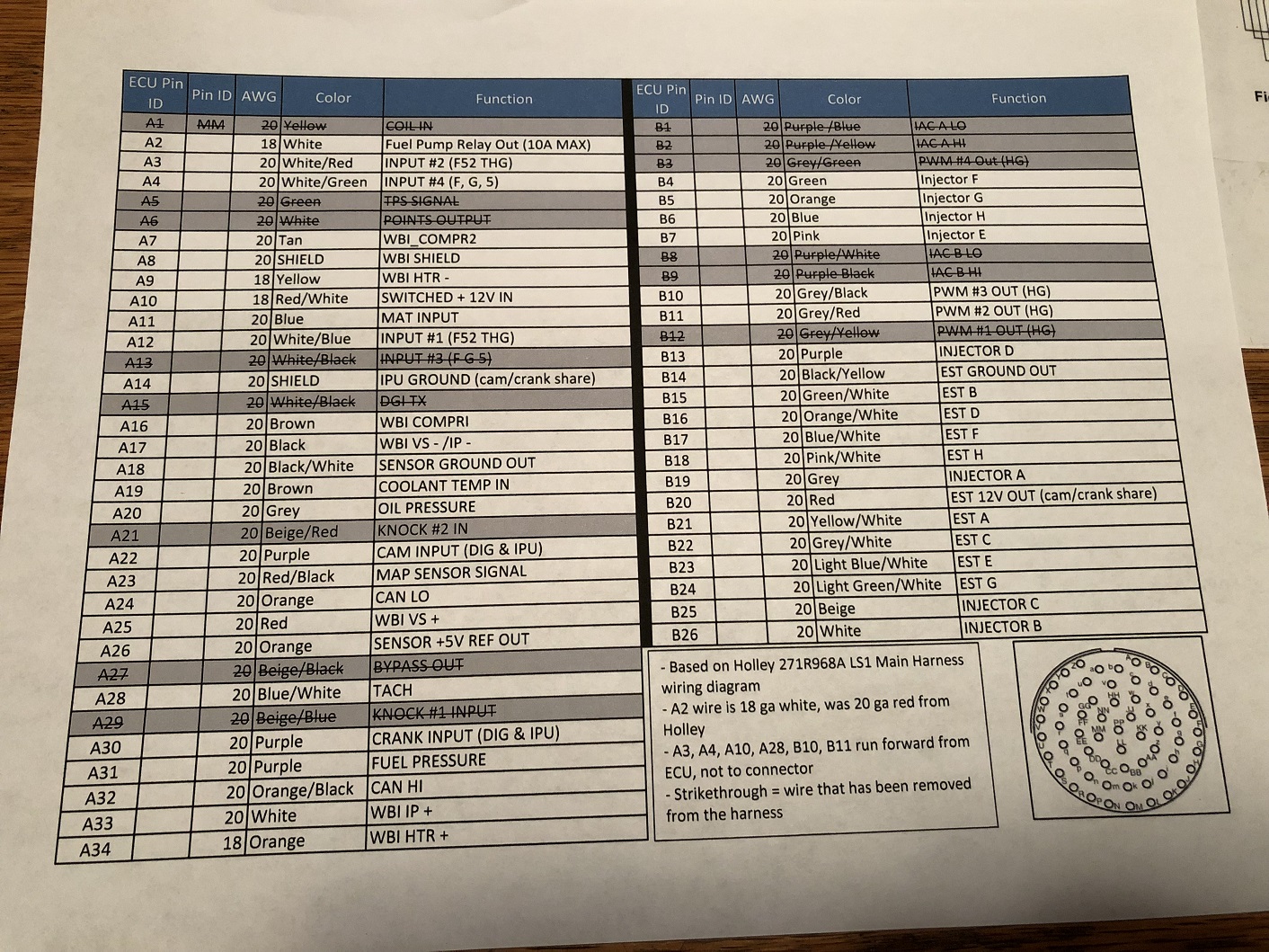 Ahead of pinning the bulkhead connector, I configured/verified and tested all the connections from the ECU plugs to the wire ends. This was also a chance to start preparing some of the formal ECU-to-bulkhead-connector wiring documentation.