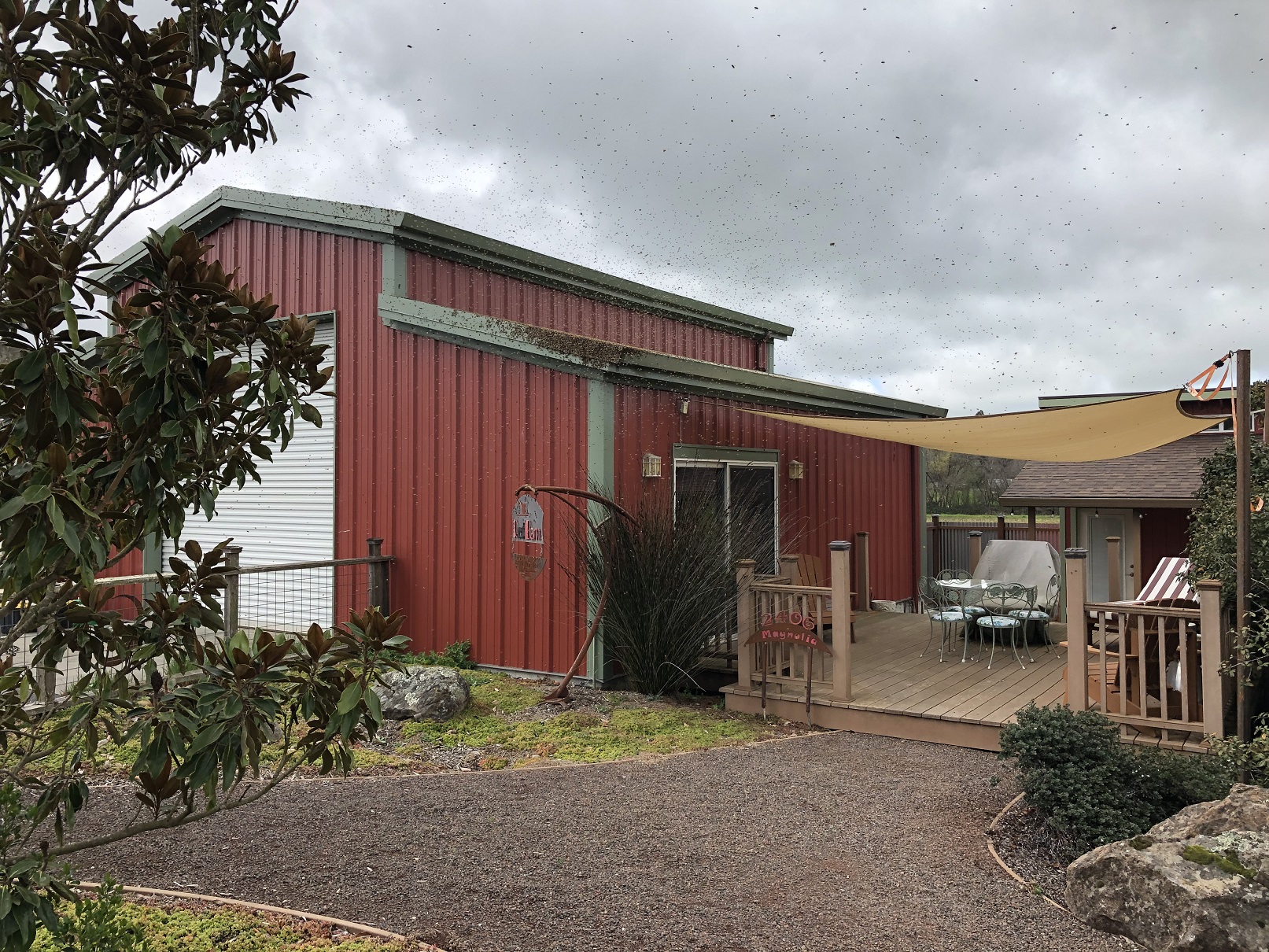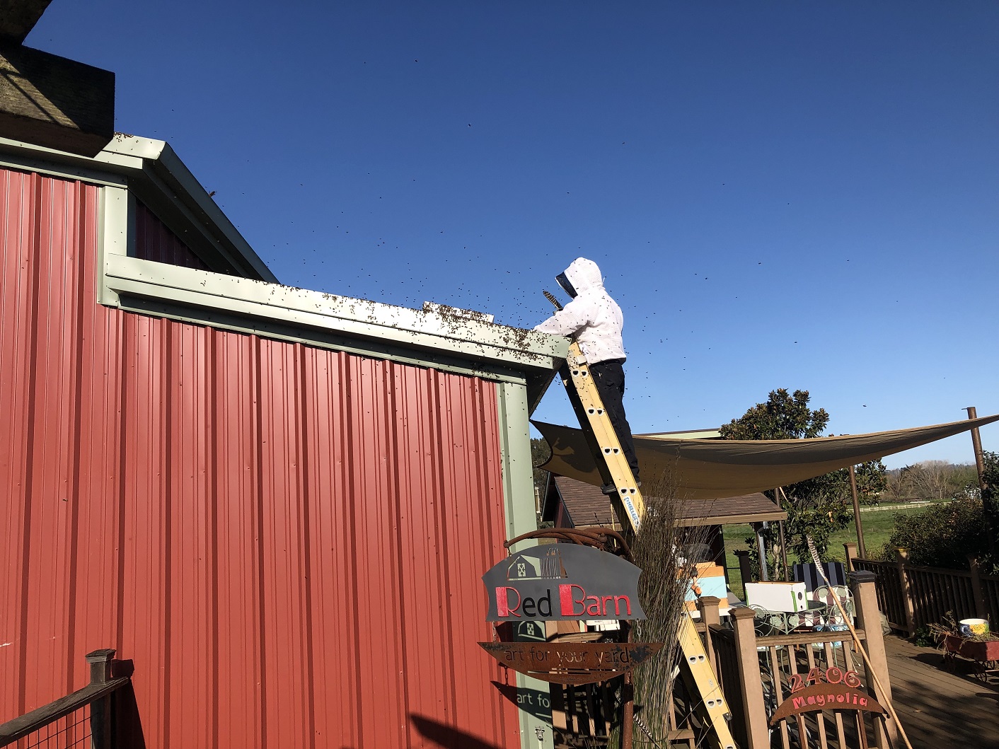 So yesterday, I'm working away on my car when I suddenly notice there's been a growing sort of "buzzing" noise. I turn around and there's a LARGE swarm of bees hanging out RIGHT outside my shop door! Yikes! I immediately close everything up and thankfully, they didn't make it inside. However, they did decide the gutter area just above the side door would be an excellent spot to establish a new hive. Zoom in on that first pic and you'll get an idea just how many visitors there are...! A quick call to the local bee keeper society and John heads right over - in a very cool '54 Chevy pick up! Anyway, he thought he'd enticed them into a bee box but when he came back last evening to collect them, the colony had decided they REALLY did like that gutter. He's back this morning with his bee vacuum and some other bee herding tools. As Bullwinkle said "This time, for sure!" Fingers crossed! Never a dull moment at the Red Barn... Attached thumbnail(s) |