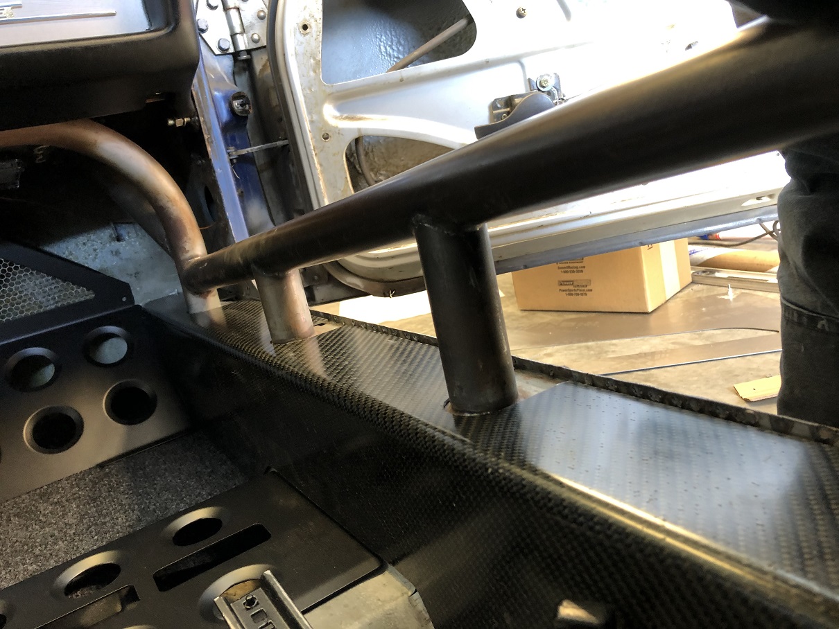 I don't think my car has an "exposed carbon" vibe - and I don't want any permanently glued-to-the-chassis carpet. I've never liked the loose look of velcroed-in carpet so I figured I could use adhesive spray to carpet these covers and end up with removeable, rigid carpet panels. Starting with the passenger side, I trimmed the panel so it'd fit just so and it'd clear the footrest and ECU cover. Attached thumbnail(s) |