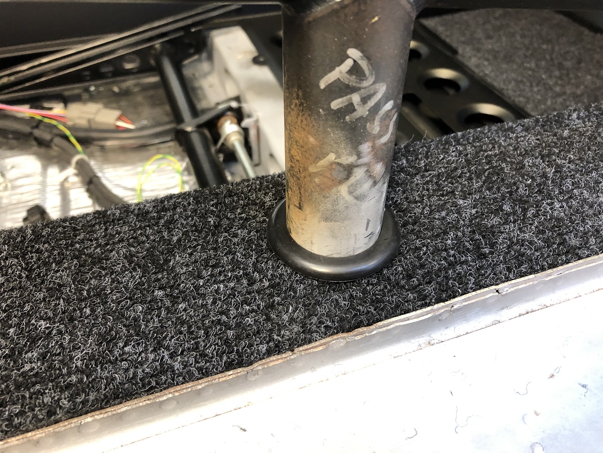I don't care for the look of the carpet simply trimmed to the bar so I found some suitable rubber grommets, cut them in half and used one side as a rudimentary trim piece. Better than nothing, at least for now. Heck, the door bars aren't even painted! (IMG:style_emoticons/default/laugh.gif) I'll work up something more permanent in the future. Attached thumbnail(s) |