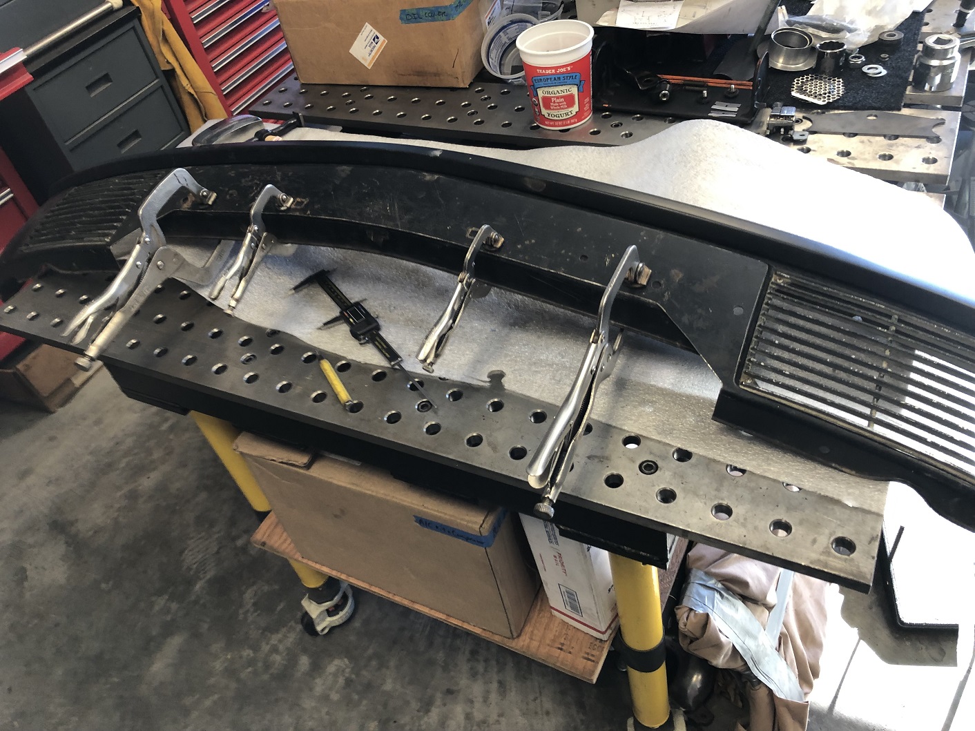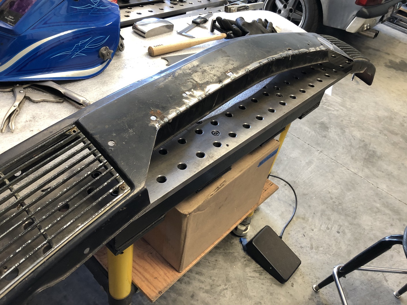 A busy day at the Red Barn. First, I went after getting the return on the bumper. I clamped the original lower edge return in place, then used a cutoff wheel to slice through both the bumper and the return at the same time. This guarantees the same shape on both pieces and a no-gap weld seam. Then I started fuse tacking the pieces together.