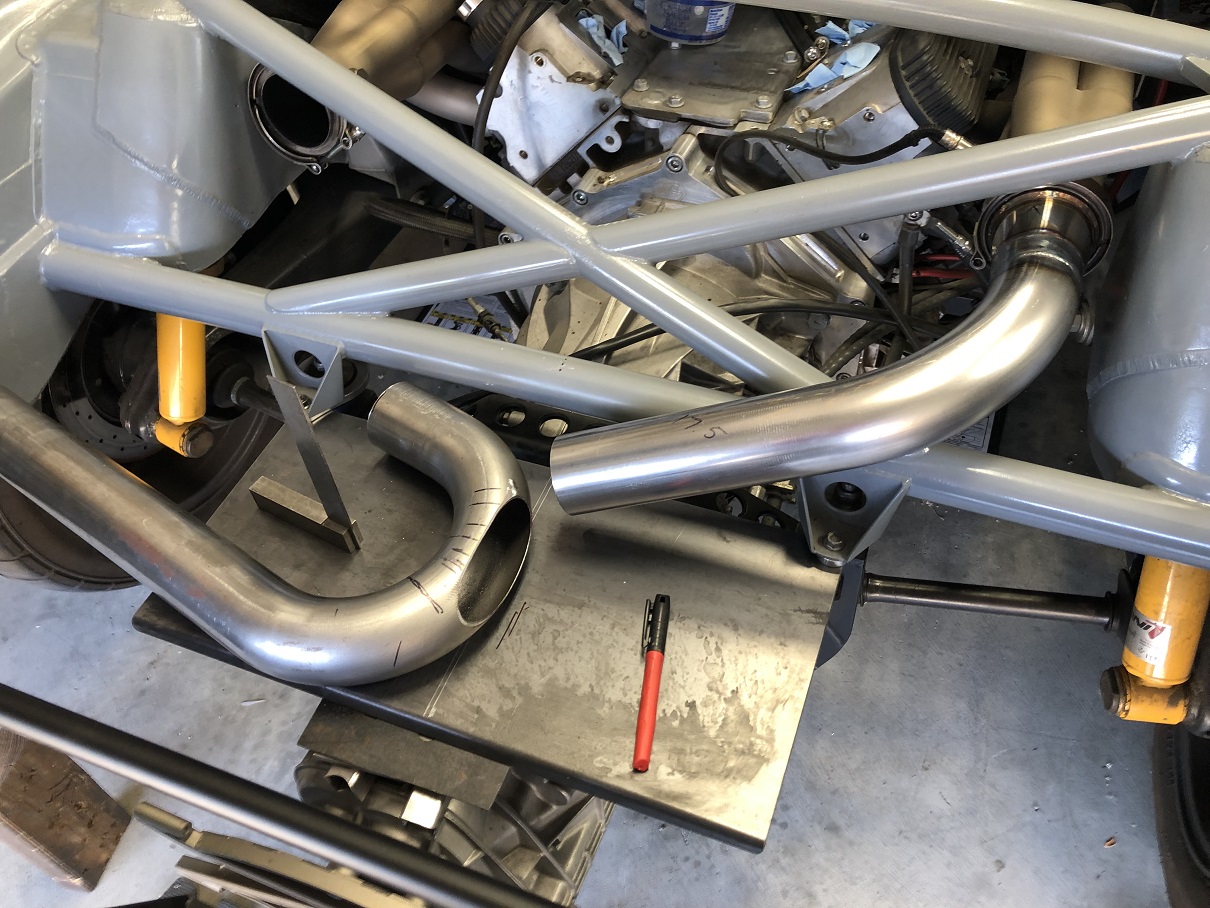 Martin and I made a day of progress on the exhaust. This part was the trickiest as it's a complicated set of joints where everything has to end up in EXACTLY the right place. It's a sorta X-pipe/merge/crossover that happens on a sloped AND tilted radius.