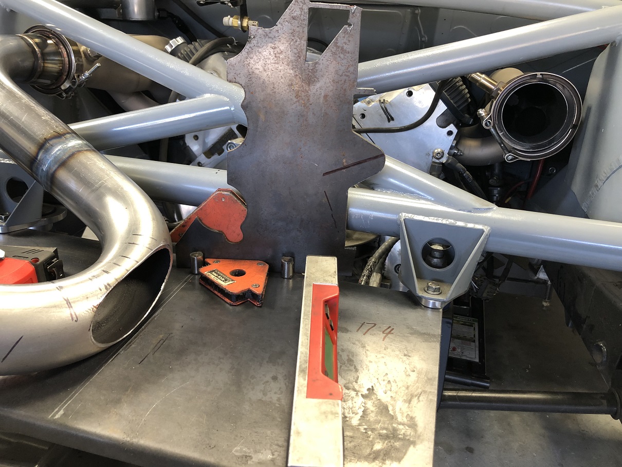 Credit to Martin for coming up with the all the fixturing that helped simplify getting everything fit. There's the simple part: a flat plate bolted to the transmission mount. It served as the floor to set the height of the assembly, and it sports the centerline.