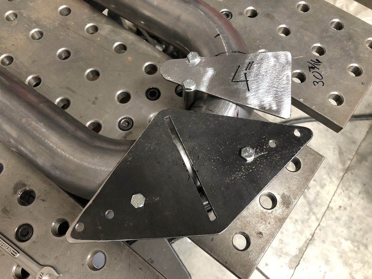 Getting accurate mid-radius cuts really makes a big difference to how tidy the finished product looks. So we ended up making a couple different "scribe exactly to the center line" tools. Both are just a plate with two pins. The big one (pins on the outside of the raduis) works on pretty much any size tube. Pins contact the tube and you mark in the slot. Note the pins can be moved to different locations to better fit various radii tubes. The little one works from the inside of the radius. Pins contact and you mark for the cut on the outside edge. They work a treat. Attached thumbnail(s) |