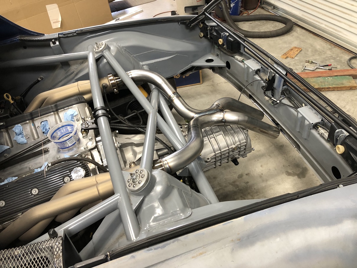 This is an inital mock up with some mufflers I had from an earlier version exhaust that just happen to bolt to the existing muffler bracket in a different orientation. I may use them, I may not. In the end, I want the trans to be visible. Attached thumbnail(s) |