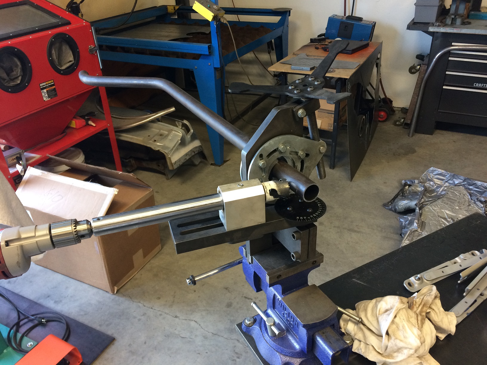 Time to miter all the tubes in prep for welding. Here's the notcher, in all it's glory, ready to cut the front hoop end of the door bar. I set the tube in the car in the position I want it and use a simple, little plastic protractor to get the angle. Then set the notcher to that angle and cut the miter. The only tricky part is that the hole in the firewall where the upper part of the door bar goes doesn't allow the door bar to sit quite parallel to the long. So I have to twist it just so to get it to line up. This causes the bends to sorta flare outward a bit... Hard to explain but suffice it to say that I have to cut the miter a bit out of line with the bends in the door bar. So, here it is ready to cut. Ready... Set... CUT! (all the while praying I measured correctly and properly set all the angles...!) Attached thumbnail(s) |