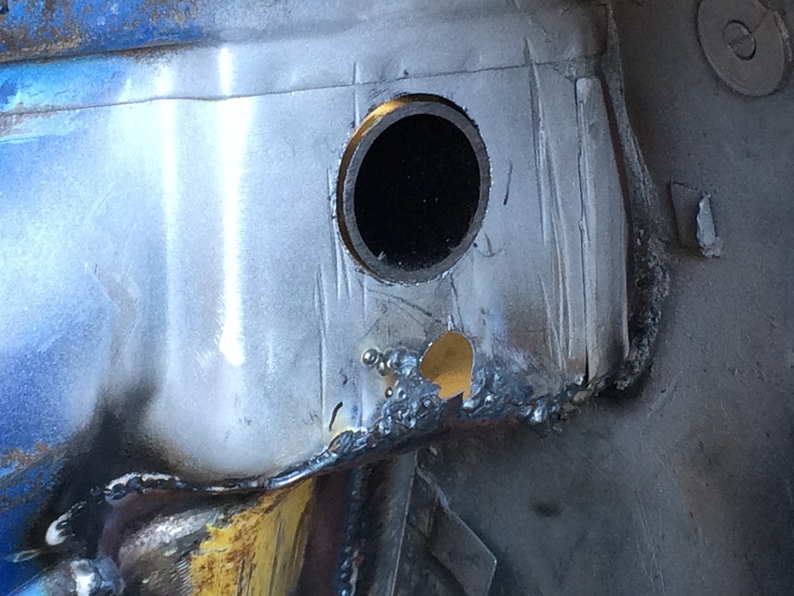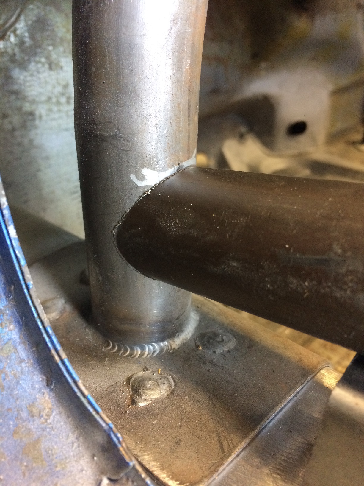 That last cut on the front of each of these tube was done with the hole saw and was pretty much a "one chance to get it right" cut that set the final angle and length of the door bar. The target length was to get this end to align with the fire wall. (IMG:style_emoticons/default/smilie_pokal.gif) It literally just sits on the edge of the hole. Big sigh of relief... Attached thumbnail(s) |