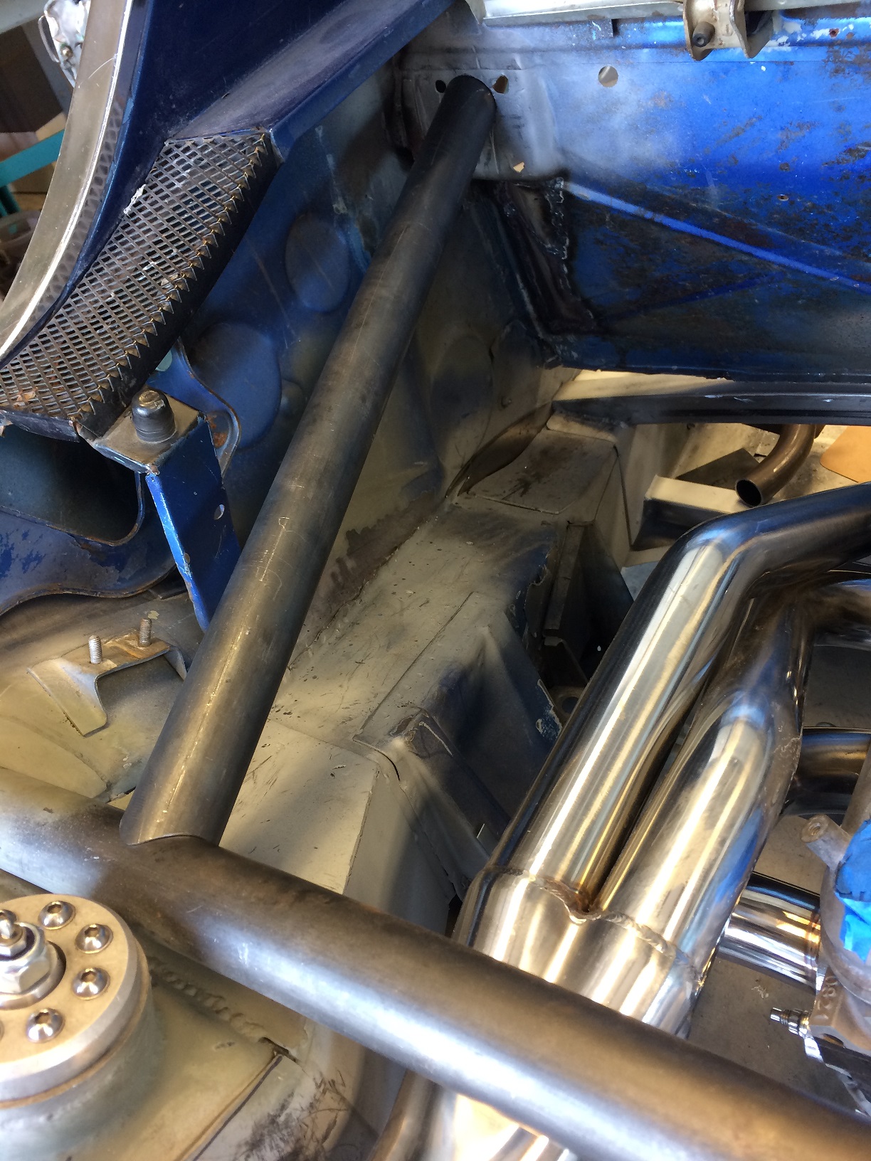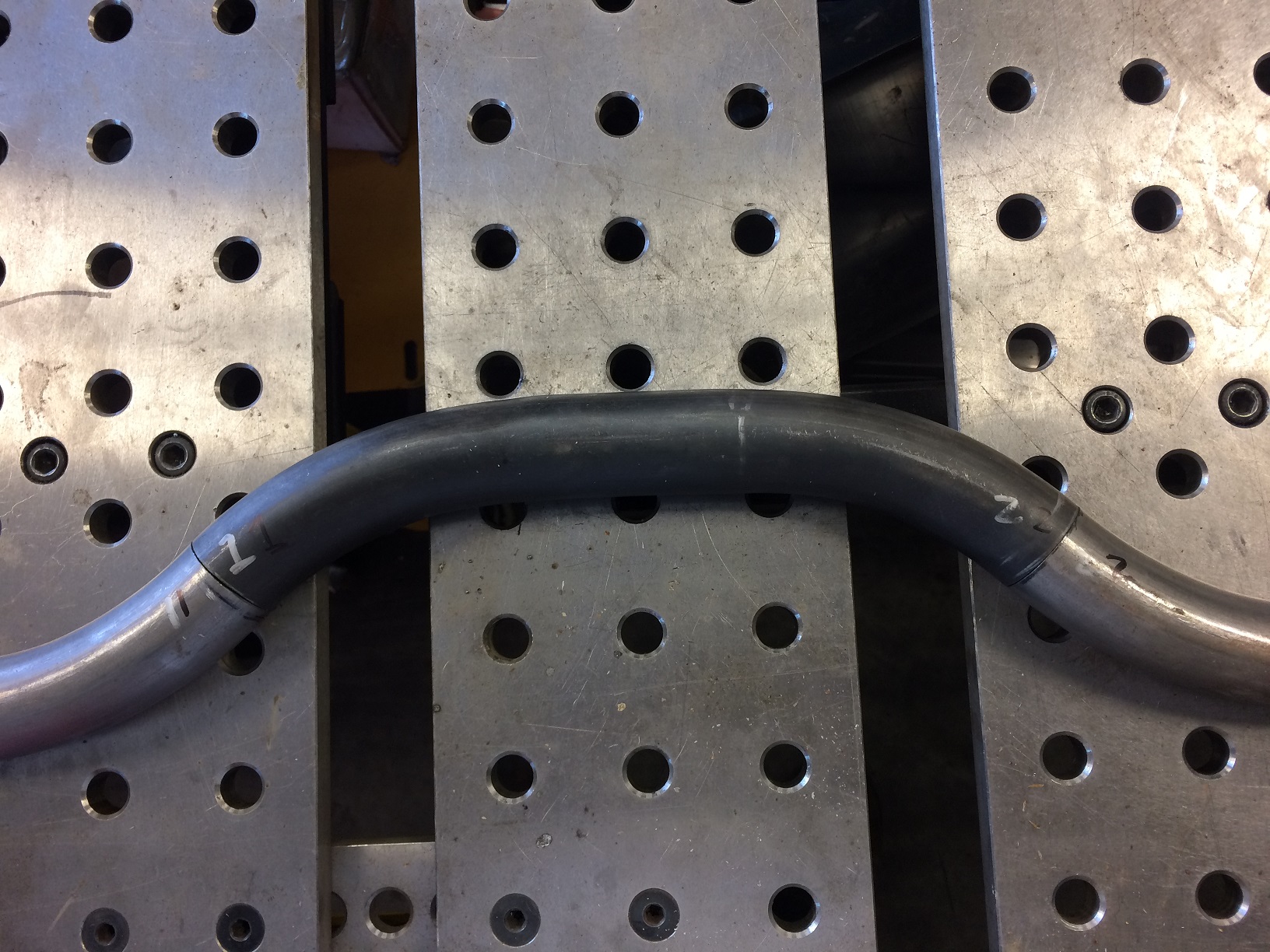 Here's the cross bar I mentioned in an earlier post - the one that has to fit behind the head rest supports then pop out/in to clear the bulge in the firewall. My bender can't do the needed double s-curve in that little space so I have to make it in multiple pieces. Before you get too excited, remember, it's not a roll cage. Yes, I'll plug weld a sleeve in both joints as part of all this. And yes, it's all DOM material. I've ordered 3 different times from the same supplier and each time, the product is a different color. I called and asked them about it and they said it depends on which mill it comes from. Interesting. But it'll all be painted so no worries. Attached thumbnail(s) |