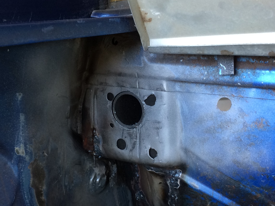 Final trimming of the door bar. This is where it pokes though the fire wall at the seat belt retractor location.