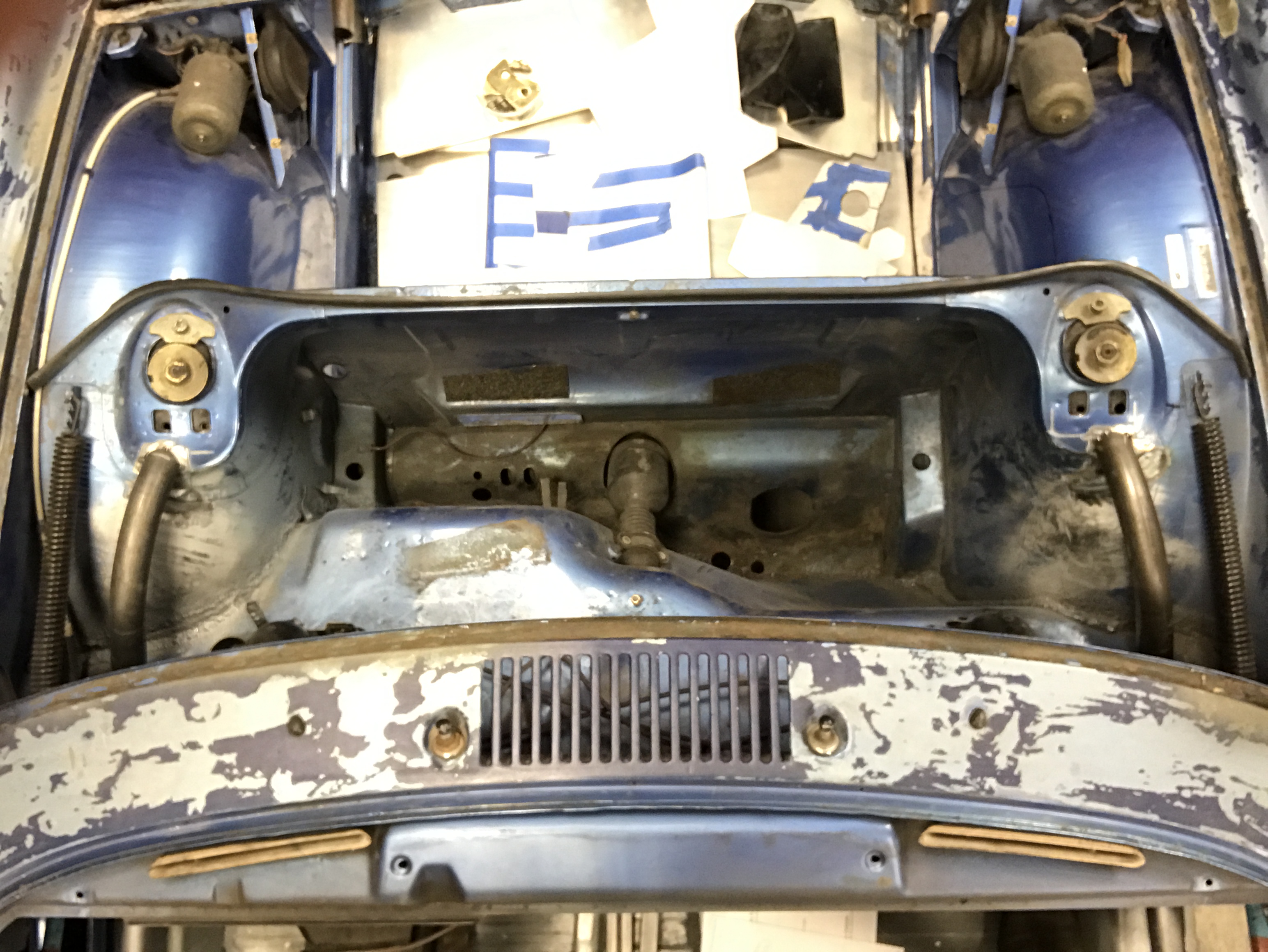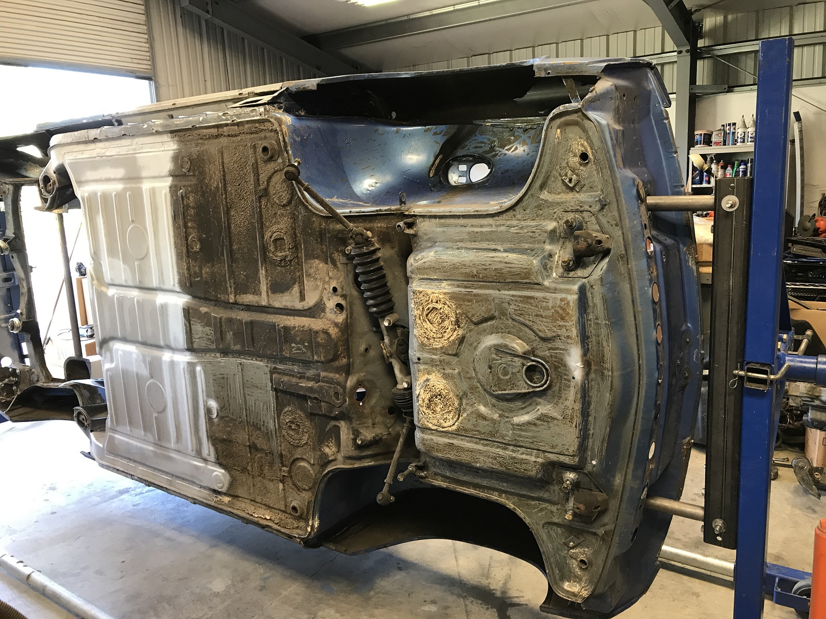 On the rotisserie once again! I pulled all the suspension then spent a bit of time scrapping off that wonderful undercoating.