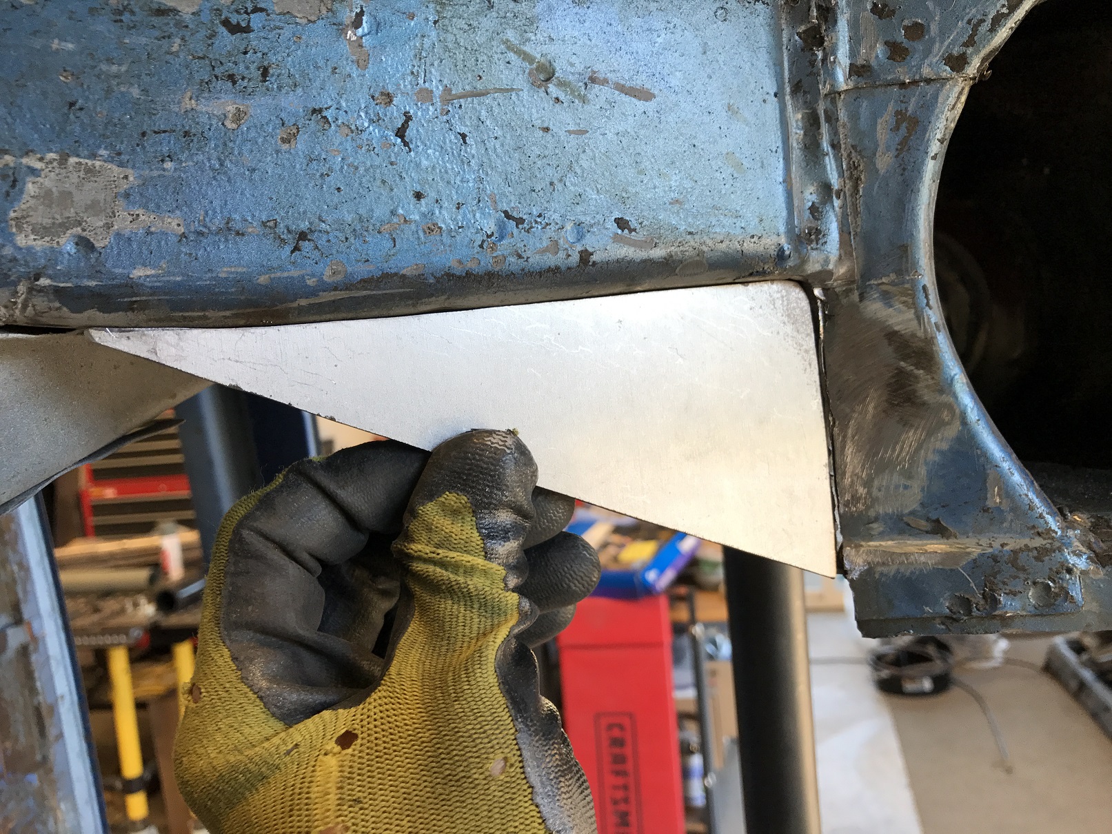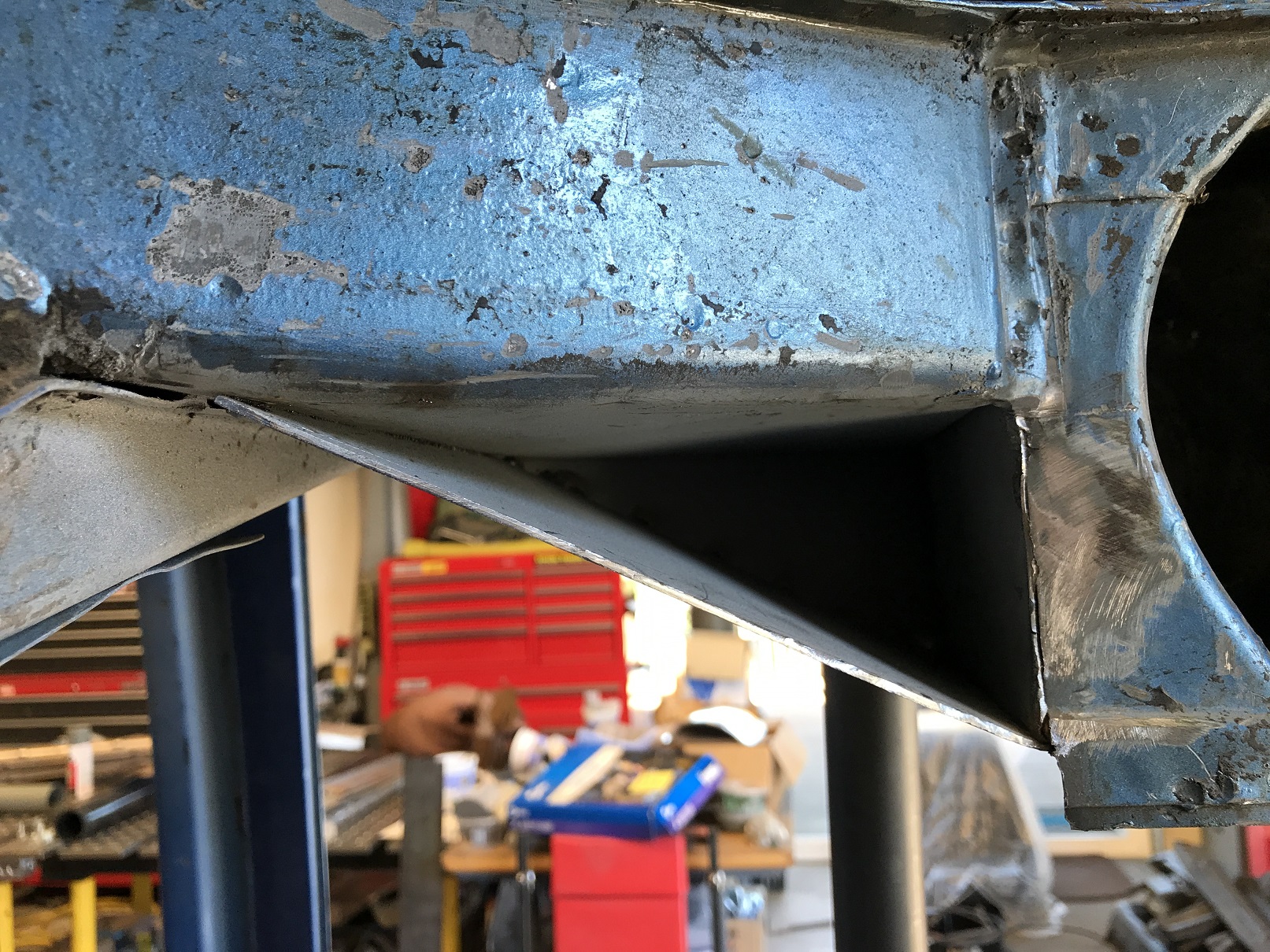 That "loose" piece of sheet metal (the vertical one in the pic) is the front side of the suspension tower. It gets sandwiched between the plate I'm holding and the rear of the tower. Once welded, it'll all be nicely locked down. Attached thumbnail(s) |