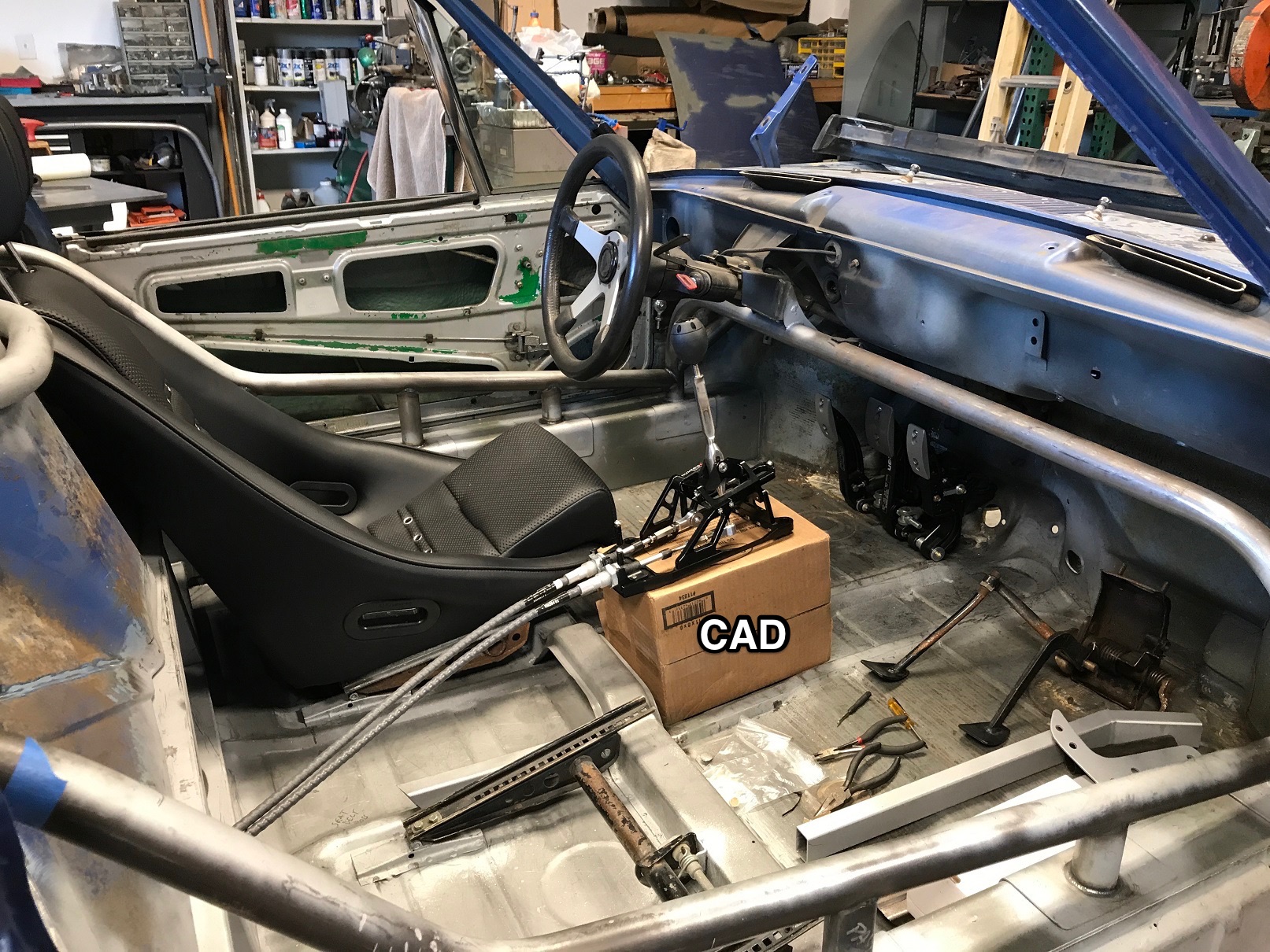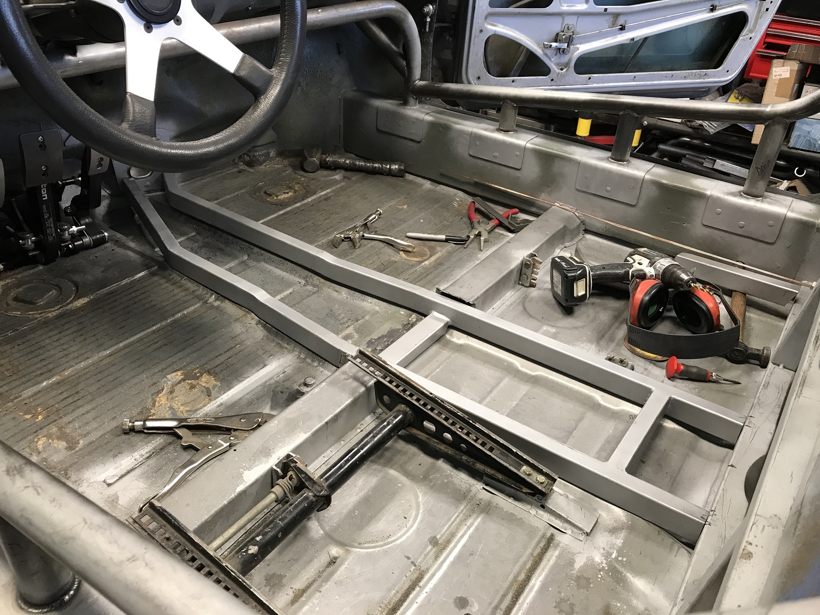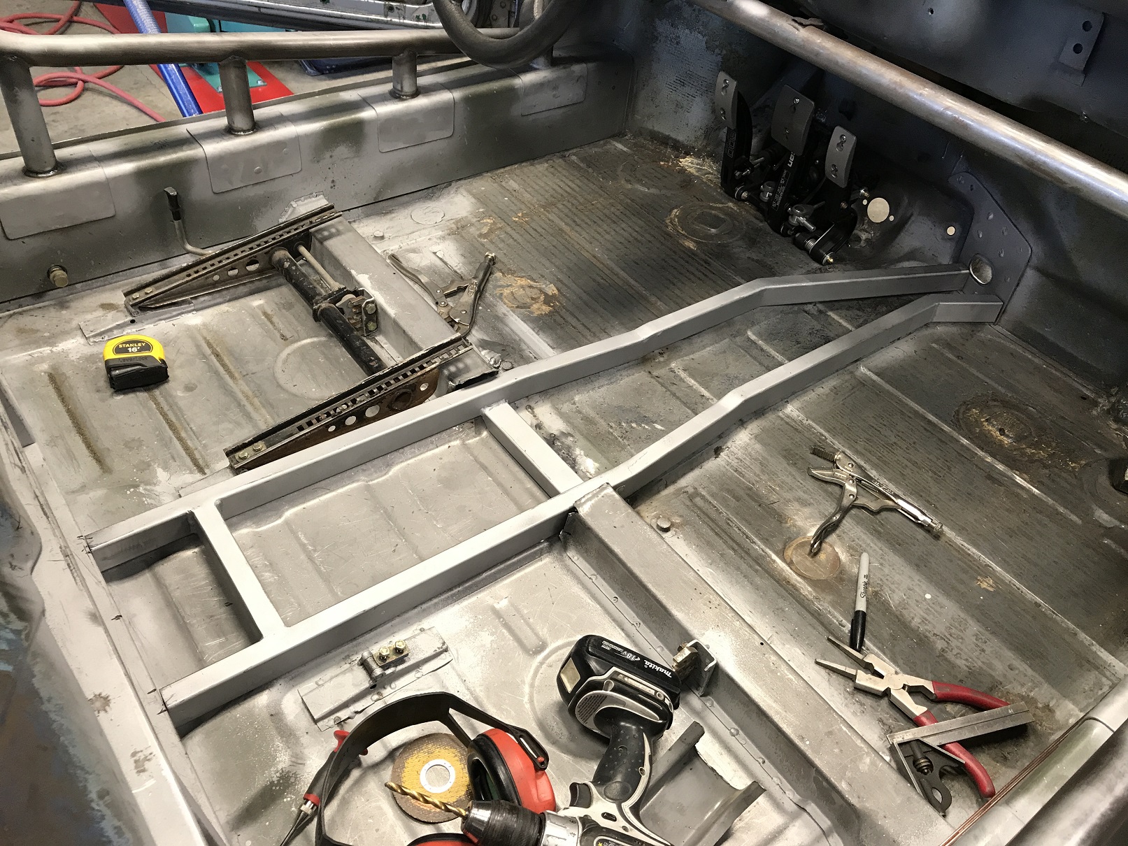Car is off the rotisserie so I can get the tunnel built and determine what I need to fab to support all the systems: fuel, electrical, shifter cables, A/C lines, throttle cable, hydraulics for clutch and brakes...