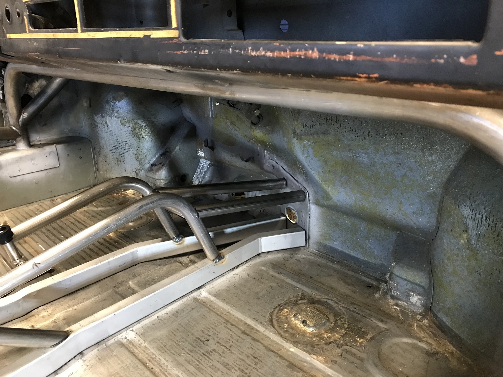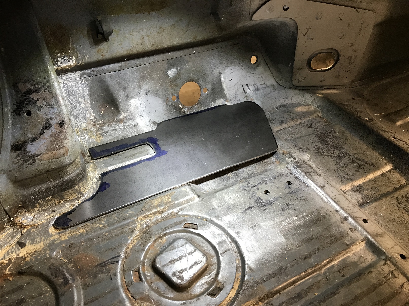 How ate you attaching the plate to the floor...or is there a second plate as well? If there is not, I believe you might find that is too small Chris. T Finished today by getting started on the pedal mount. First step is to level out that area. This piece gets me started. Good point - that's the "filler plate" that gets me to level, then I plan a larger plate that'll give me a bit larger footprint, will tie into the console and further back toward the seat and closer to the driver long. |