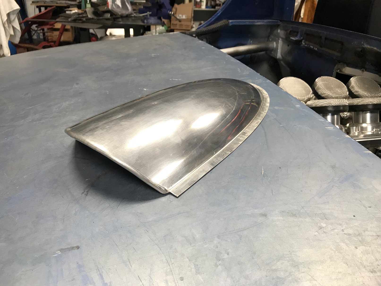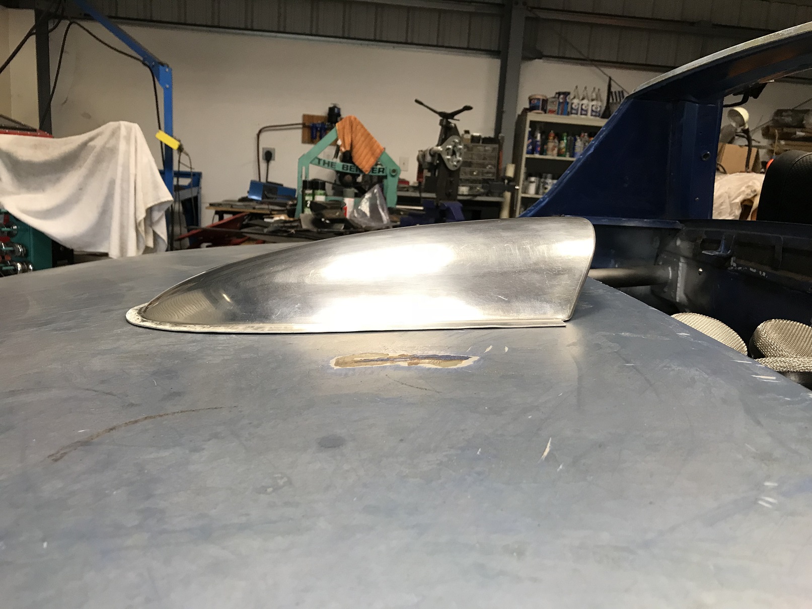 As I'm working to fabricate the fire wall access panel and looking at the other sheet metal work I have to do, I realized I don't yet have the skills I need to get the results at the level of quality I want. So the project is going on a "sorta hold" while I practice. To help speed this along, I've signed up to take a 4-day coach building course from Wray Schelin (Pro Shaper) in MA. http://www.proshaper.com/ In the meantime, here's a small hood scoop practice project I did. It turned out nicely but it just feel like much of it was luck. So, off to school I go... You better find time to visit my shop when you come to take Wray's course! I think he's only half an hour or so away. |