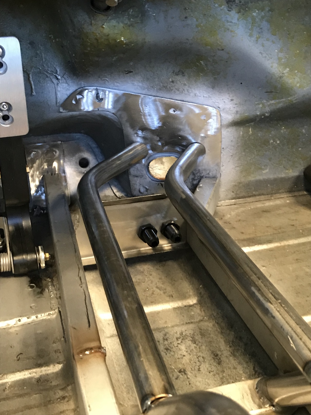 And here it is in place. The hard lines will run back to another bulkhead at the rear of the console and the soft lines will run up through the same location as stock: through that there oval hole.