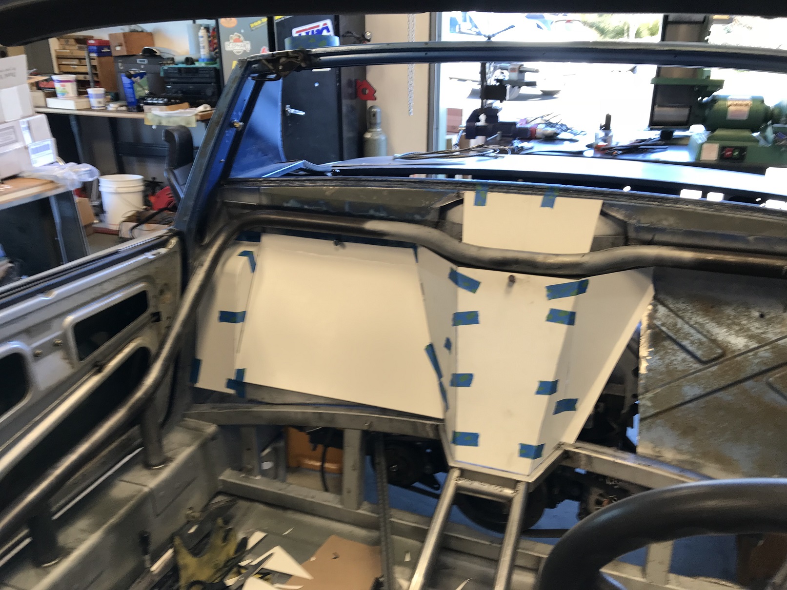 The latest thinking is that I'll remove virtually all the stock fire wall (leaving the window seal area and the vertical section below what) and build a new one from scratch. Part of today I: - fabbed a new, larger upper rear section of the console. This is to give me more room for fuel, clutch, brake, throttle cable, etc. - mocked up a wire frame of design V1 of the access panel Attached thumbnail(s) |