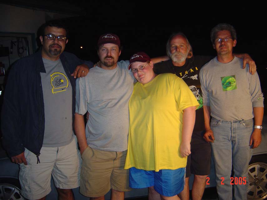 I am heading over to pick up the truck in about `5 minutes. Had a crew of people over here till around midnight. Got to meet Scott and Teri, Joe sharp, Lagunero and Thomas were all here till then. Thomas got here around 3:30 yesterday and stayed to the end last night. The only thing left is to hang mirrors, bumpers and plates, and interior. I can finsih the rest up there. Many thanks to everyone. The car looks much better than it did. Here is a pic of the midnight crew at Sklines garage.