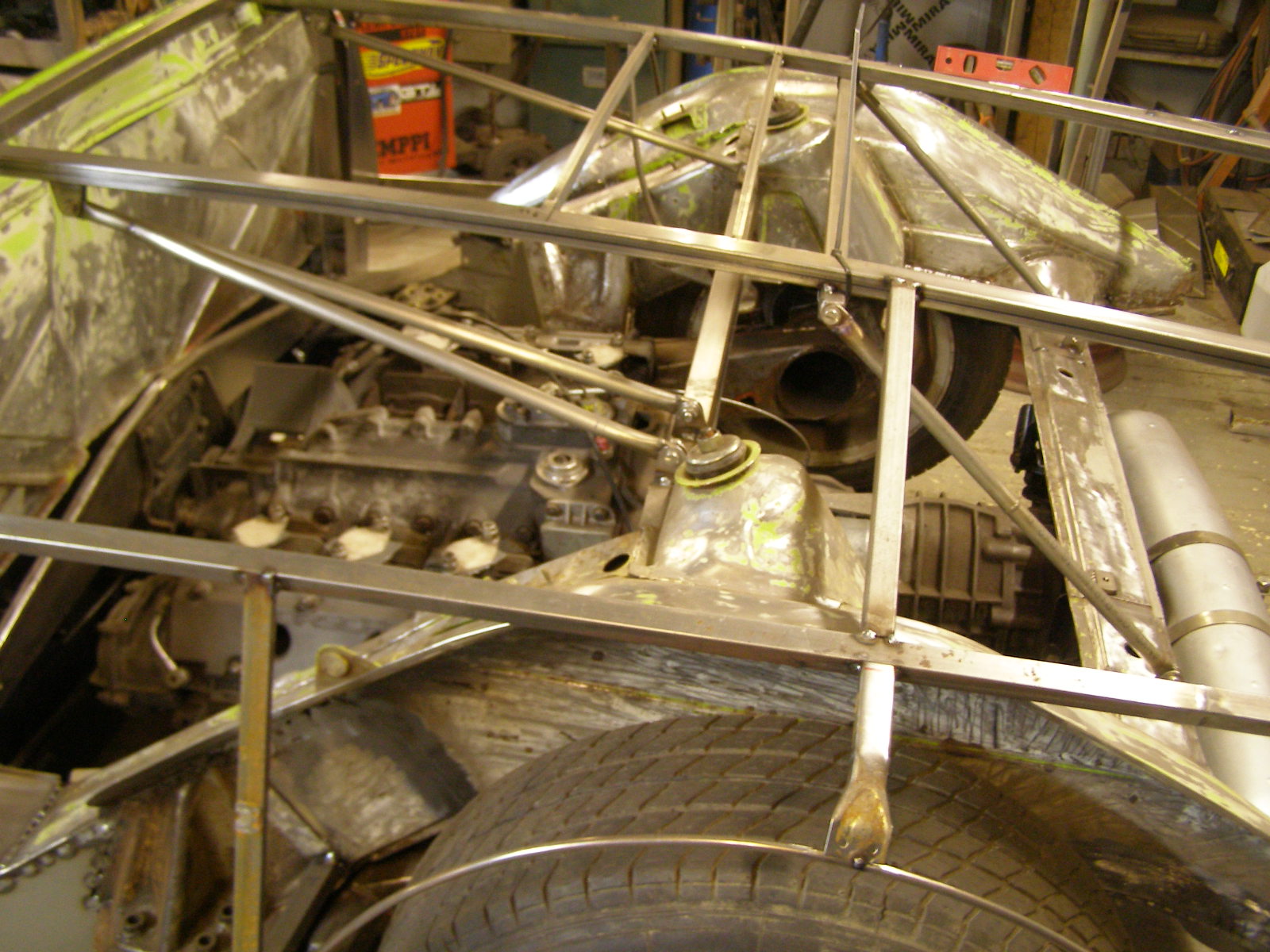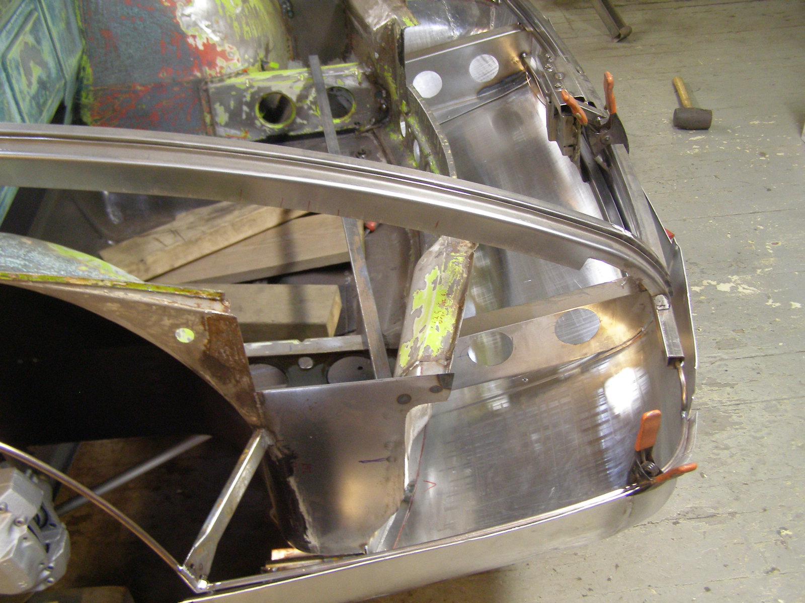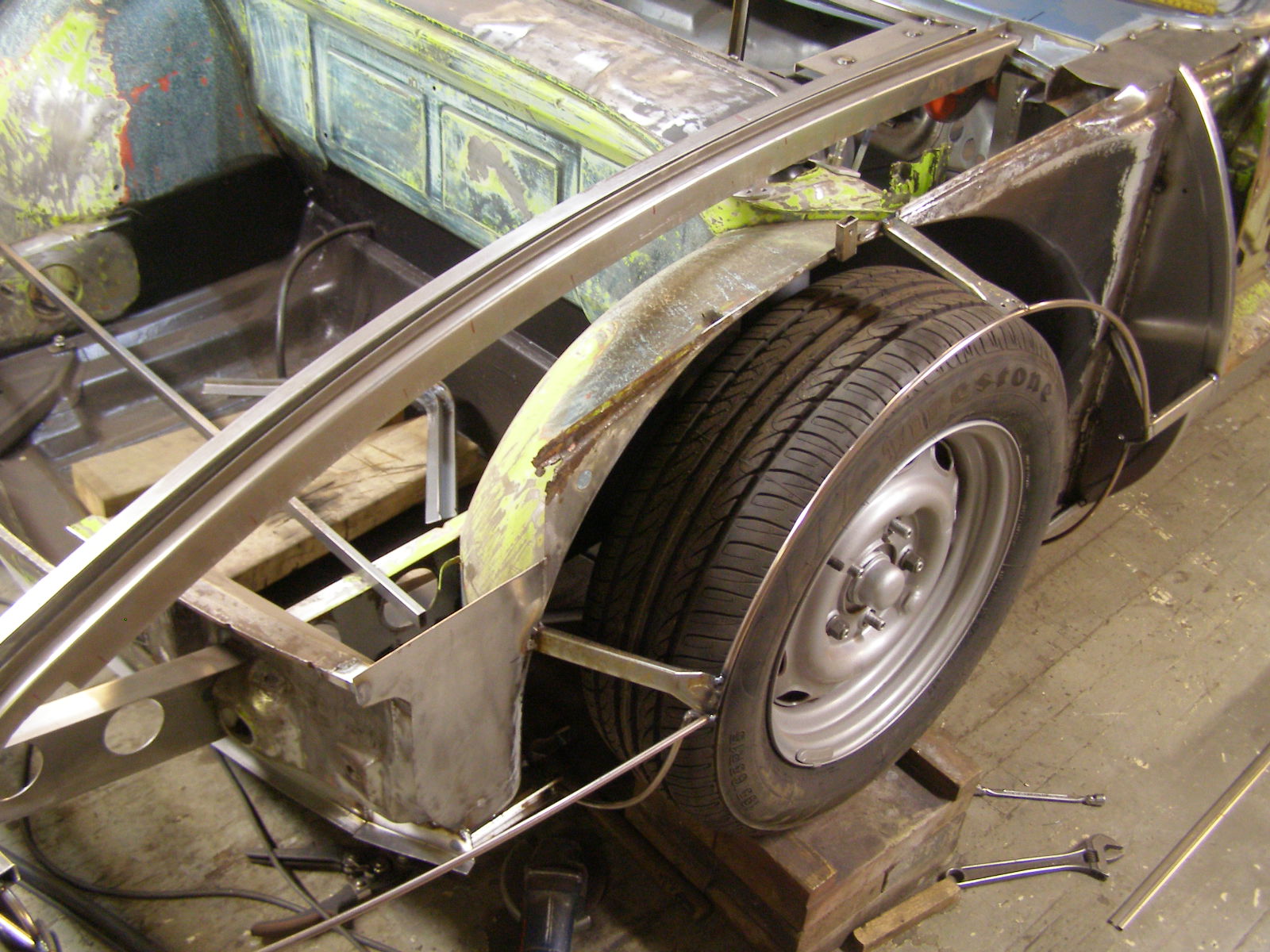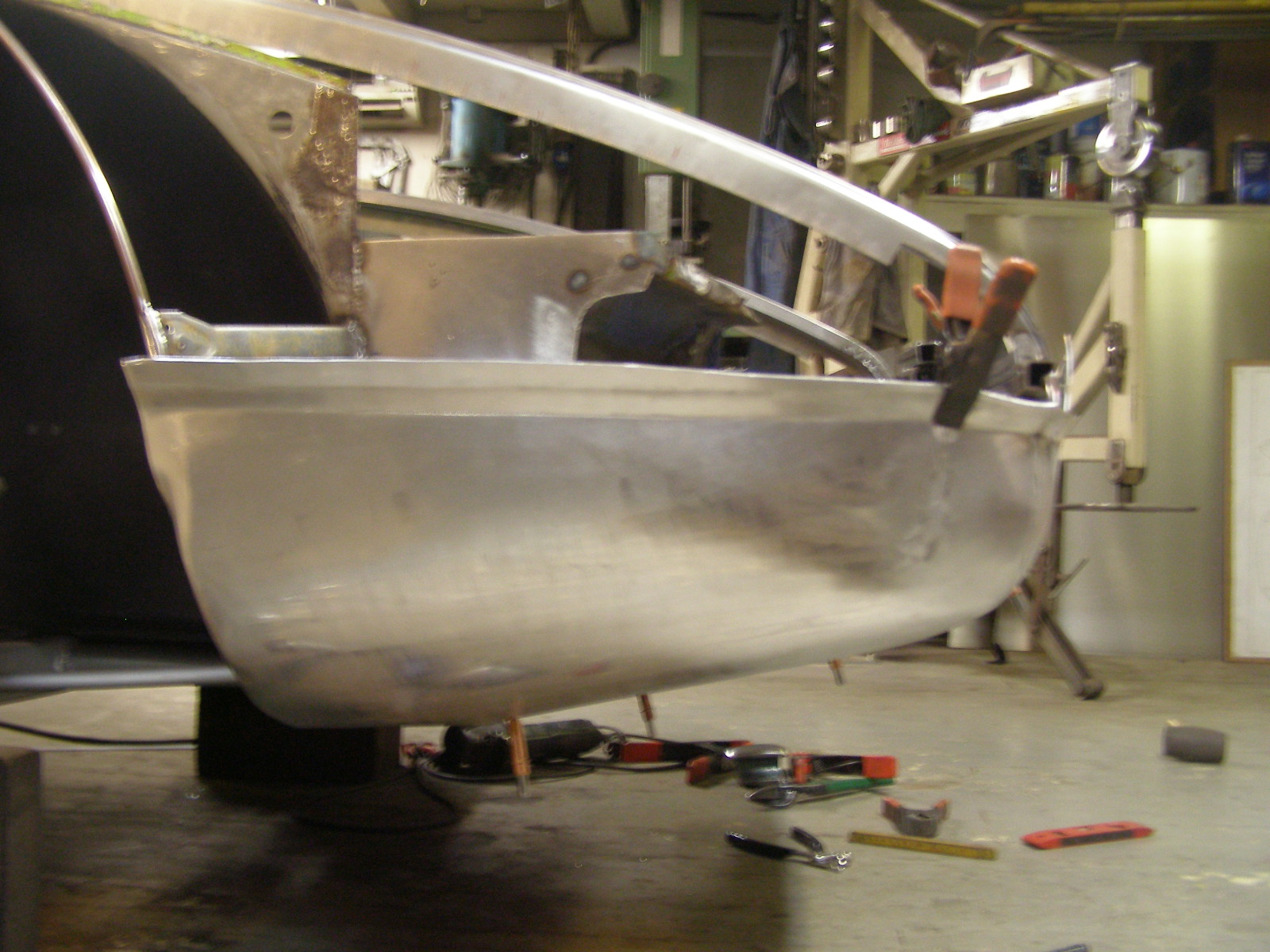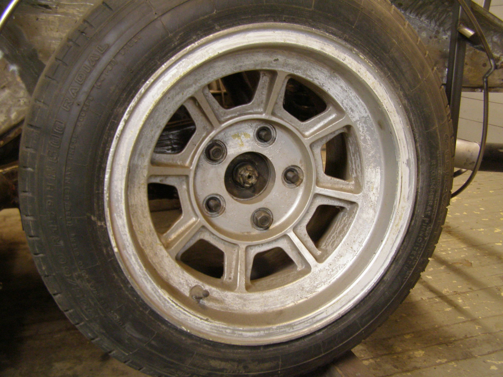 I'm thinking of folding the alu skin around the steel structure.Also using aircraft rivets ,but under the windshield I was planning to epoxy it to the steel. Working on the structure today for the front fenders....wasn't good enough. Do you know what kind of wheels this is?They are only marked with the size,9x15. They were on a Porsche that came from Sweden in the eighties. I have four of them,but need two that are 7x15 in front. Tried to order from group4wheels,but they don't answer..... |