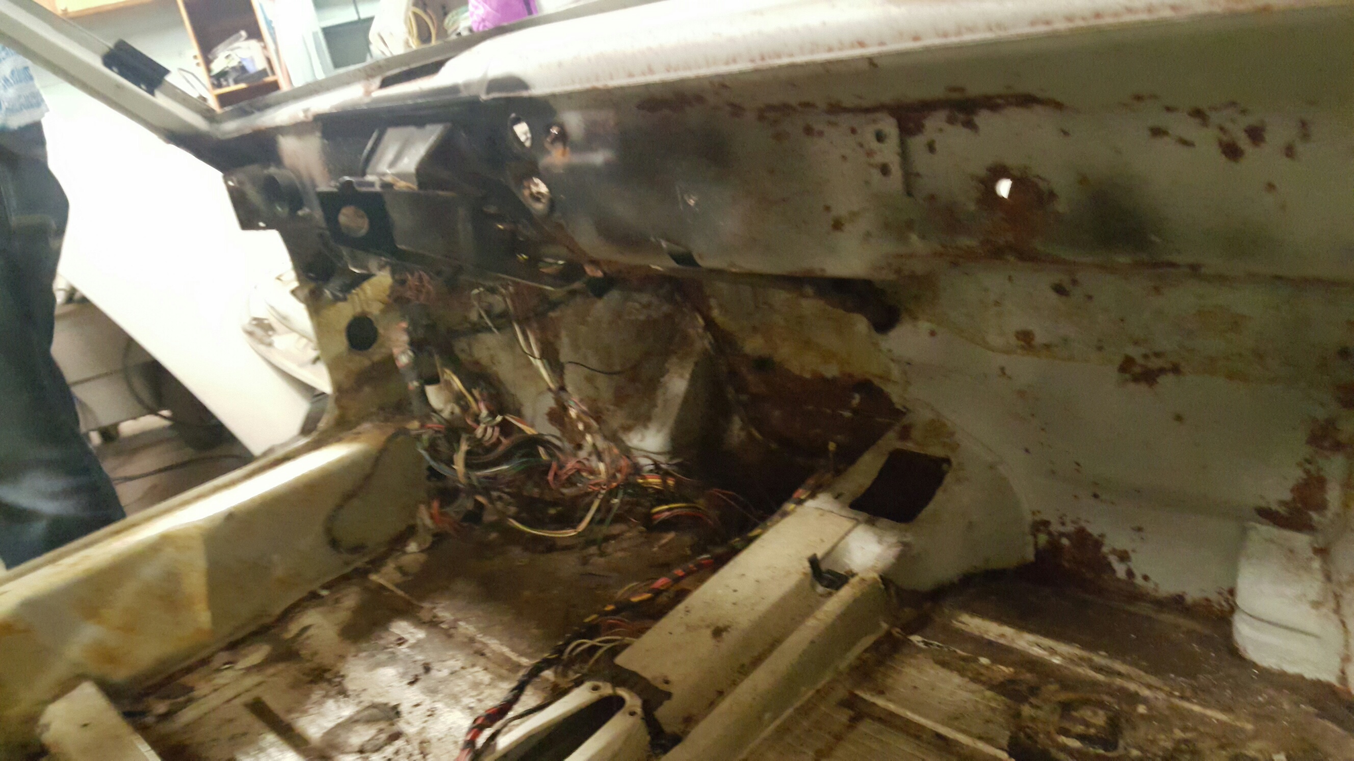 The backstory is that Wes got it in Oakland where it had sat behind a rib joint for some time. Apparently, some rodents made a home in the air box. They also acquired a taste for ribs. It appears the brought a few back with them. They were there for some time, and urinated eating the bulkhead out. The hell hole and floorboards look good. The pan is intact and looks good. He has a bunch of work ahead of him, but it will get restored back to stock ivory white. Attached thumbnail(s) |