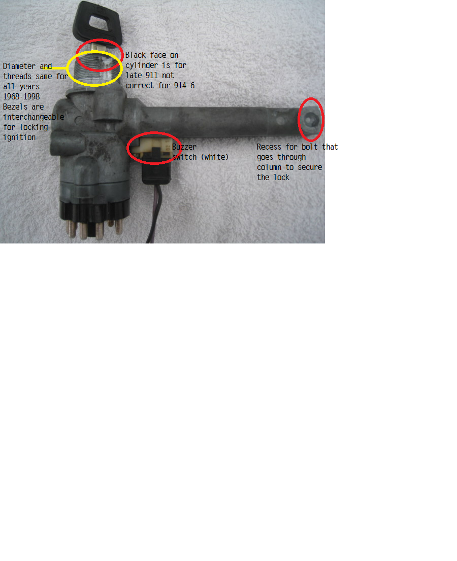 What if you don't care about the column switches. Can't you just cut the arm off of the 911 ignition switch. Keep enough of the arm to use the buzzer switch? Is the buzzer switch the part to the right of the main tumbler ? IIRC the mechanism at the end of the arm will have to work; spring loaded ? The 911/914-6 steering lock will all mount the same way, but there are subtle differences throughout the years. It's up to the owner if they want to be period correct in appearance and have correct profile key. Early locking ignition had spade connectors not bullet. Attached thumbnail(s) |