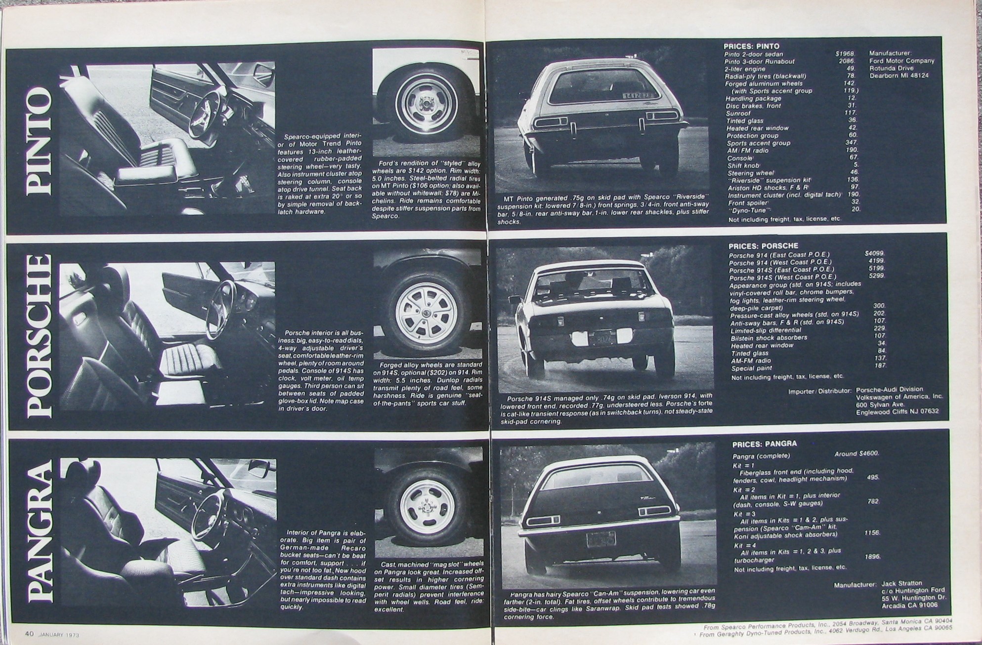 > Note that between this article & the later April R&T one, the "naming" was changed from "914S" by Porsche, when R&T used 914-2, & later Porsche used 914-2.0 "officially", but continued to use up Porsche+Audi's (USA & Canada) 1973 MY sales brochures with "914S" until they were gone & replaced with later ones using "914-2.0" which IIRC wasn't until the 74 MY introduction. Also note that the 914S mpg at 18-22 is way off the actual later R&T specs & in real life was up to the mid-30's mpg highway. In real life LA/SoCal area use, I regularly got 25-30 mpg city & 30-35 mpg highway on trips ... sometimes as high as 39 mpg. (IMG:style_emoticons/default/beerchug.gif) (IMG:style_emoticons/default/santa_smiley.gif) Tom /////// |