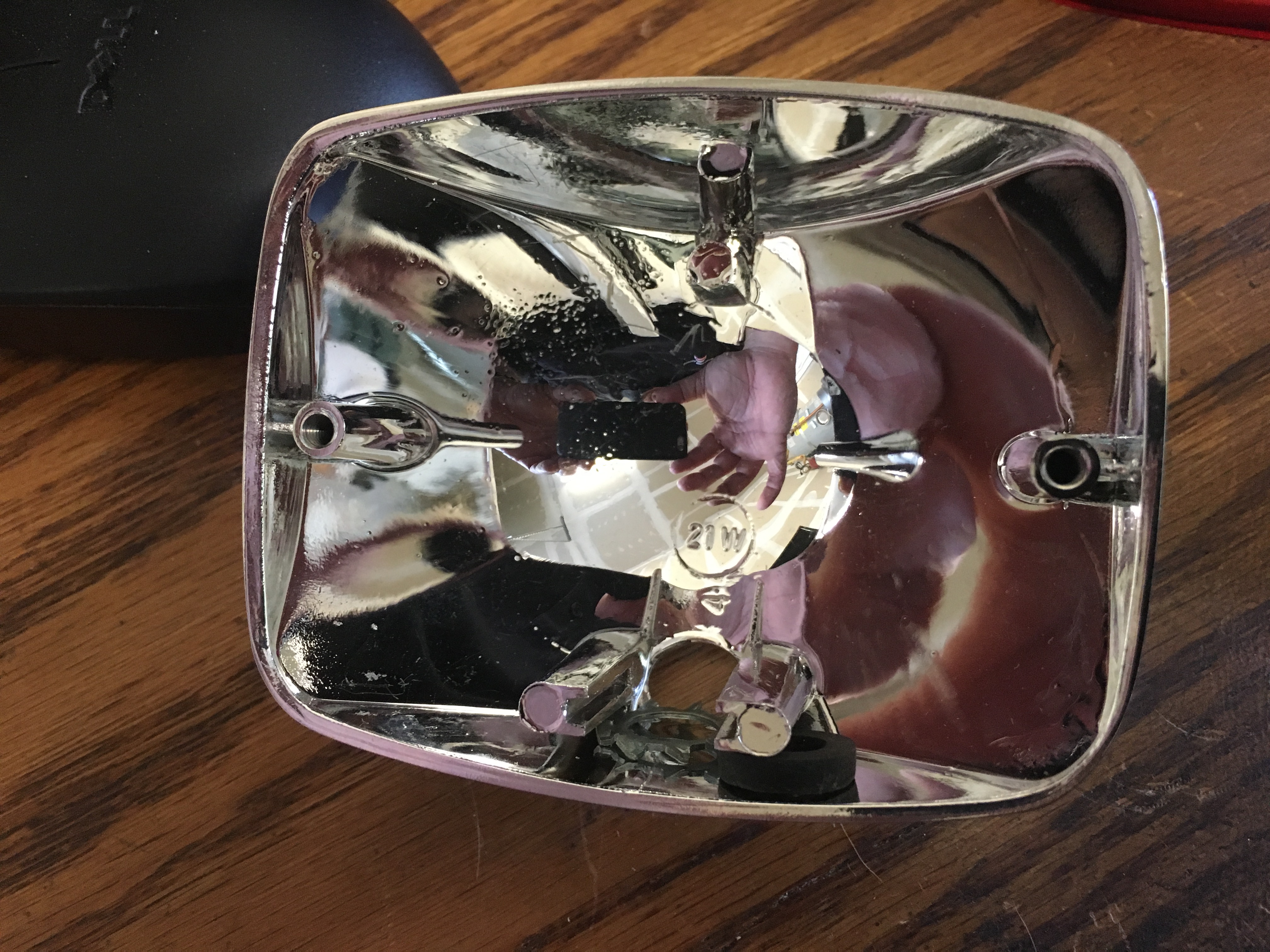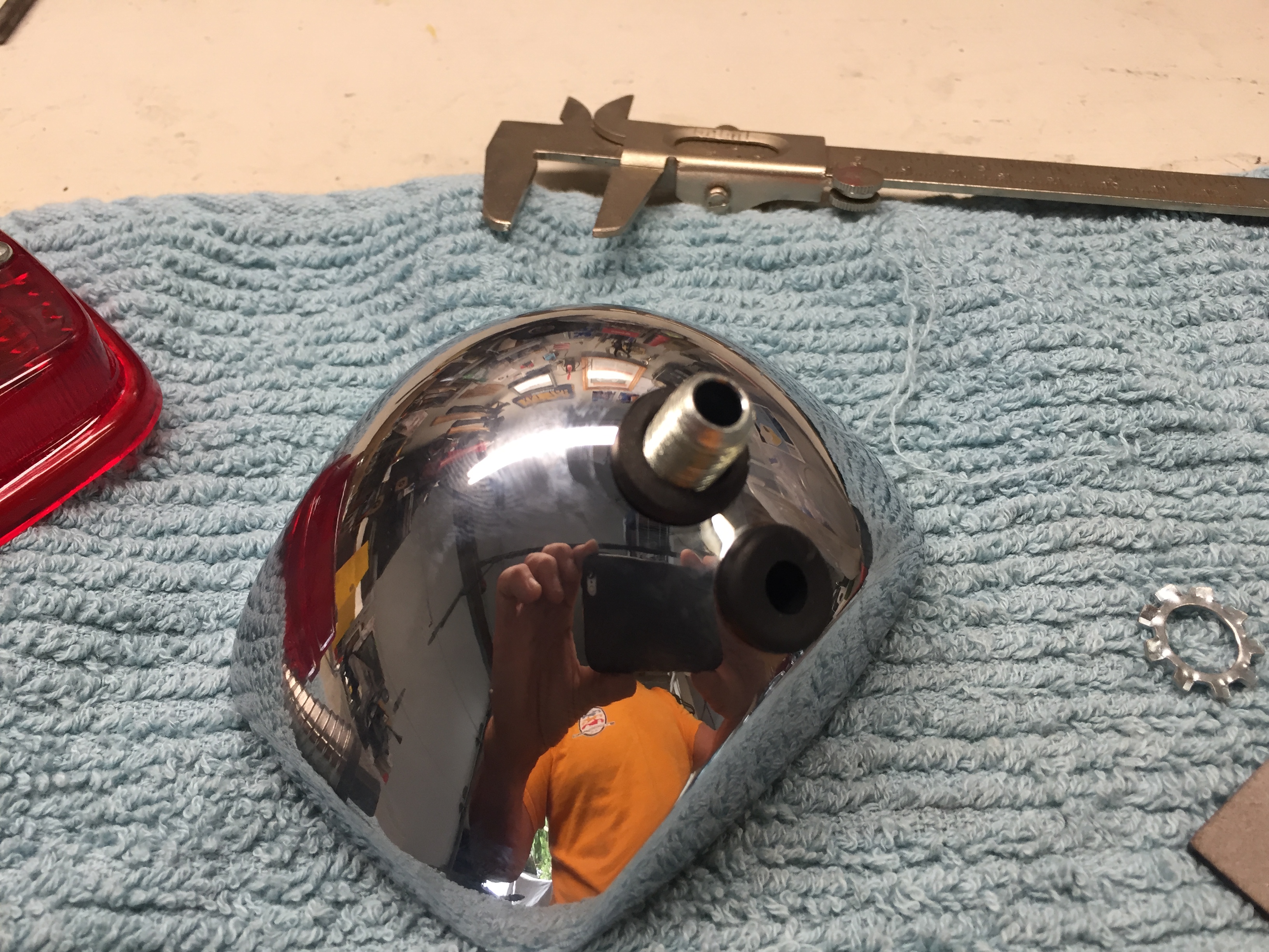 Drilling out the back of a convex chrome light is a bit of a trick, but I did it on my bench here. Make sure you use a punch as a starter, or it's not going to happen. |
