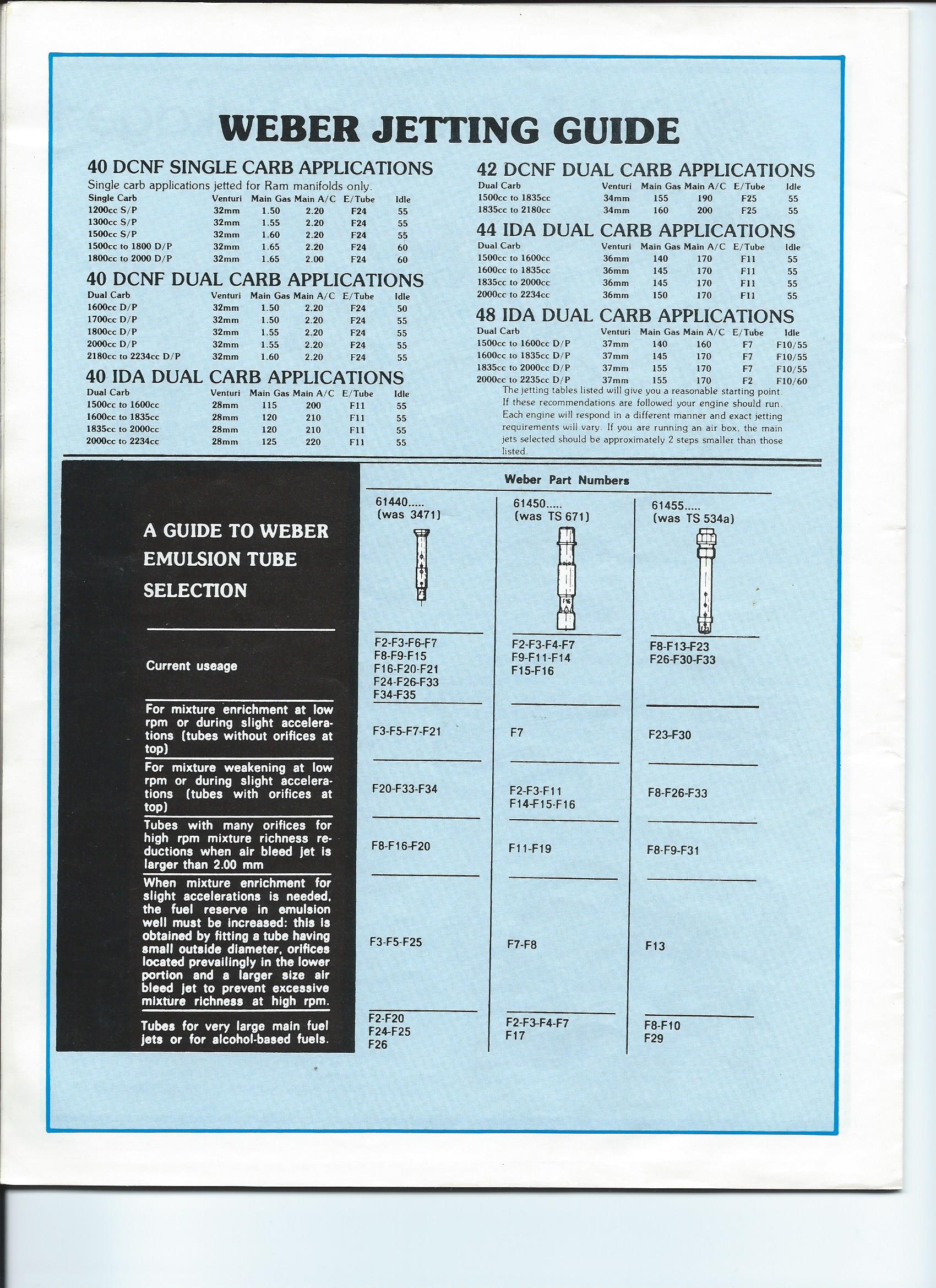 If all else fails, you can email a guy called Bud Pauge who works for Redline Weber. He's a fountain of knowledge and has helped me out twice now - once with 40DCOEs and just this week with jetting my 40IDAs. He was very quick to point out modern gas runs a lot leaner, so the older charts may not be give the best possible results.