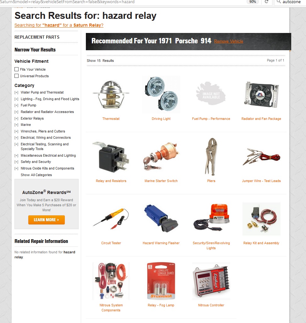Did you try re-installing your original flasher. Quite honestly the flasher does very little besides flash when you put the turnsignals on. If your original flasher flashes the exterior bulbs ok, there is nothing wrong with the flasher. Likely you have some wiring issue external to the flasher. The link above takes me to partsgeek. Autozone doesn't list a flasher or hazard relay for the 914 although it has some other interesting items for the 914. I was wondering why my 914 is so slow. Maybe I need a new Nitrous Controller. (IMG:style_emoticons/default/av-943.gif) Attached thumbnail(s) |