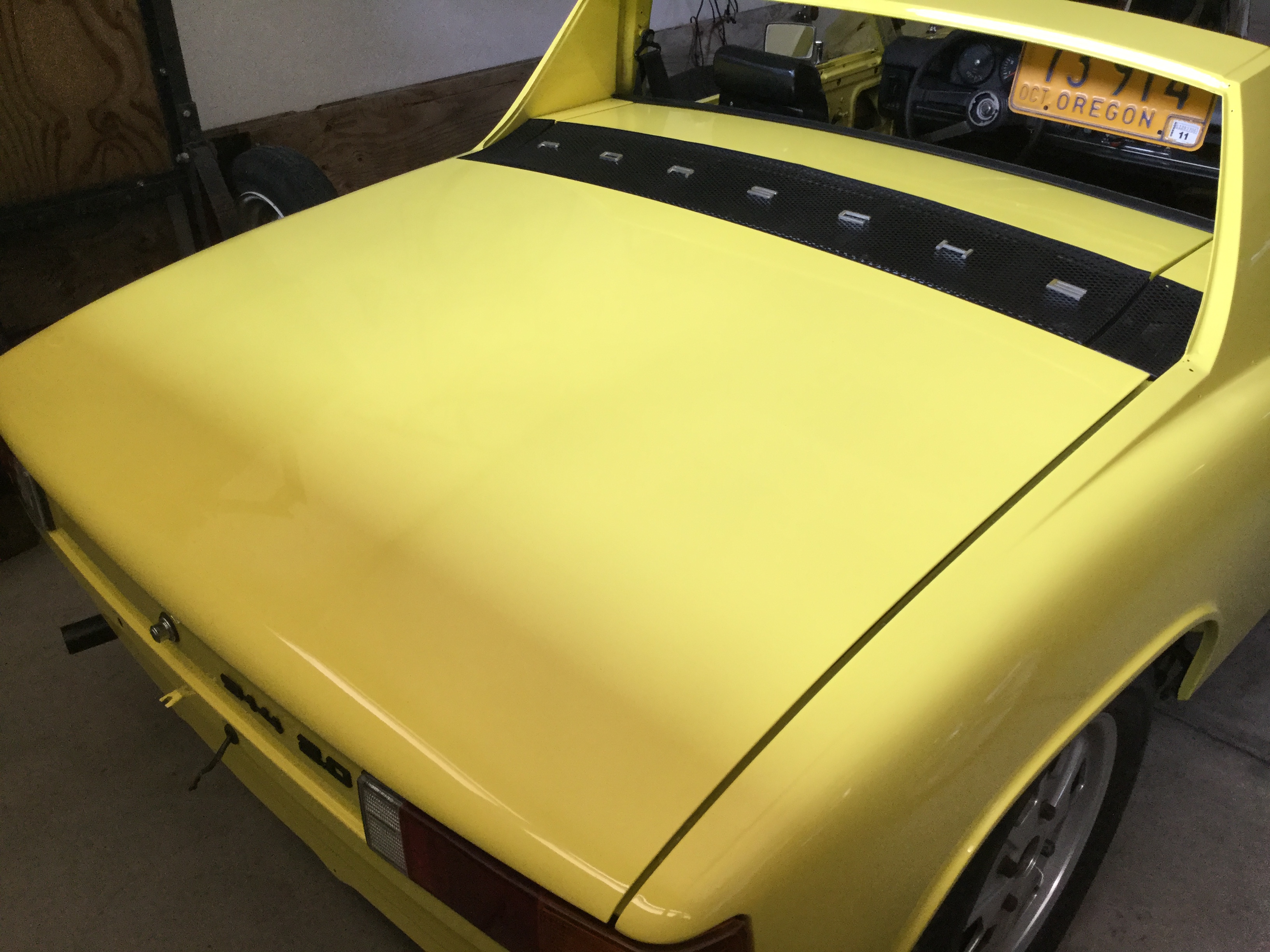 All the lights except the license plate lights in back are on and tested. Horns are back as well. Rear deck lid seals are on, and I spent a fair amount of time today repainting the black on the deck lid and then refitting the refreshed engine grill.