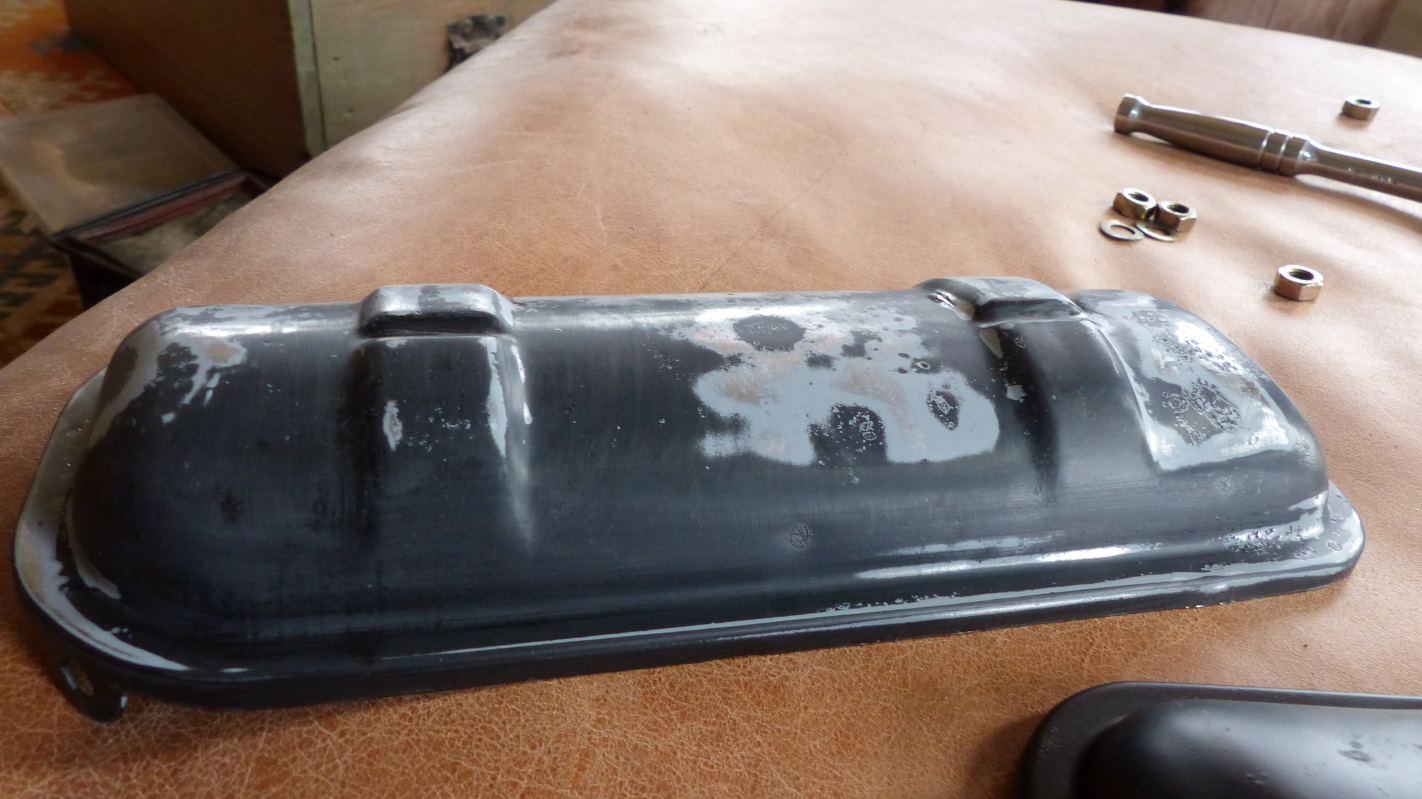 The problem with the valve covers is solved! Sure enough, it was a bad can of paint. After baking the pieces earlier today, I decided to try just dry sanding them with 320 grit to sand off all bad paint. Then I dewaxed and sprayed with a fresh can of the same stuff. This time it flashed off evenly within minutes of application like it normally does and dried to the same semi-gloss as previous cans. It didn't register with me until I pulled my respirator off as I left the garage, but the bad paint lacked the strong solvent smell it should have had. Something was definitely off with it. I put the last coat on the covers less than two hours ago and they are already dry enough to handle. I'll give them a bake tomorrow but I'm glad that's over. (IMG:style_emoticons/default/cheer.gif)