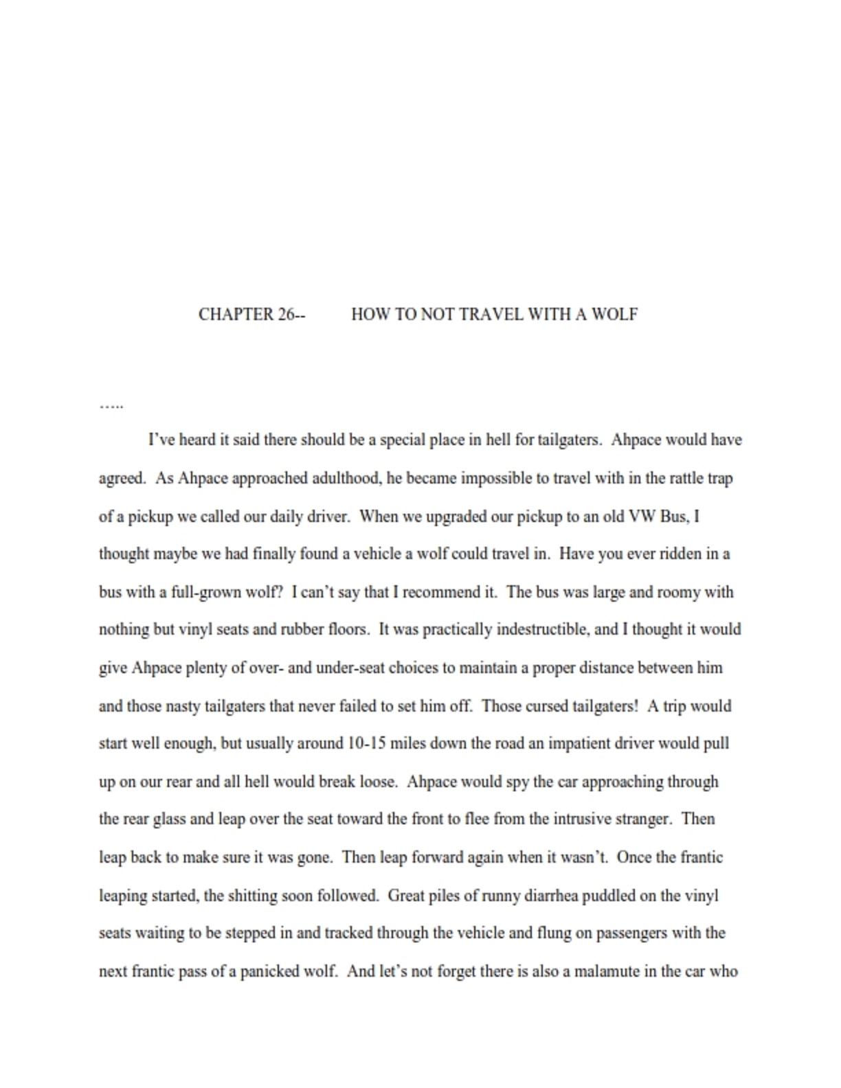 the incident led to one of the most fun and memorable days of my life. ..................because........come on,don't keep us hanging !! Oh that's kind of a long story and I'm not sure how entertaining for anyone who wasn't there, but here is an excerpt from a rough draft of a chapter in a book I'm working on about our wolf that contains the story of when the bus engine went boom. ![]() ![]() ![]() ![]() ![]() ![]() |