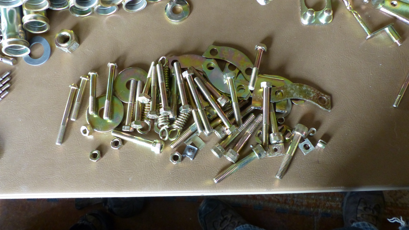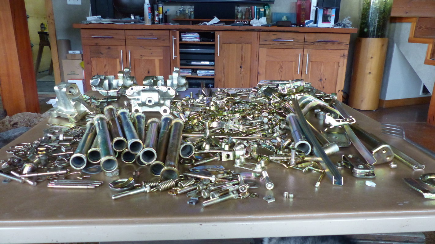 Imagine my excitement to unpack boxes from the plater today. For the most part, the parts look fantastic. There a few (less than six) parts that had some spots of encrusted rust I thought would dissolve off with pickling that didn't so I'll have to clean and re-plate those. The brake calipers didn't turn out as nice as I had hoped considering the prep work I did on them. They are okay, but concave recesses are dull or burnt and didn't take the yellow chromate. Makes me feel a little better about the trouble I had plating them. I'll keep an eye on them and will send down to Utah for real cadmium plating if they start to rust. ![]() but Houston, we have a problem. A BIG problem. How many brake calipers can you count? ![]() I count 3 and a half. Not good! Not good at all!!! (IMG:style_emoticons/default/headbang.gif) And that's not all. Here are the parts I've fished out so far that were bagged separately and clearly marked to be finished in black zinc and baked. I'm pretty sure I can strip the yellow chromate off and turn them black without too much trouble, but more concerning is that I don't think they were baked because they were mixed in with the main batch of yellow zinc parts whereas the smaller batch of hardened parts I had bagged and labeled for baking were shipped back in a separate bag. If I'm right, the unbaked hardware includes those irreplaceable brake caliper bolts. (IMG:style_emoticons/default/blowup.gif) ![]() Why didn't I just do those myself? (IMG:style_emoticons/default/headbang.gif) I'm waiting to hear back from the plater. I'm hoping that missing caliper half is large enough it will be found and returned to me. I hate plating!!! |